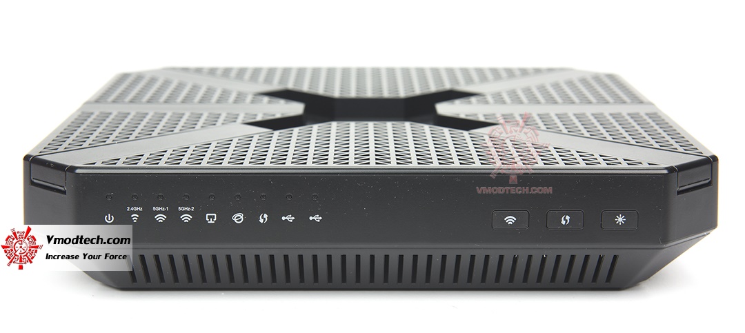 มองจากด้านหน้าจะเป็นไฟแสดงผล จากซ้ายไปขวา พาวเวอร์ 2.4GHz, 5 GHz แบนแรก, 5GHz แบนที่สอง, สถานะการเชื่อมต่อแลน สถานะการเชื่อมต่อกับอินเตอร์เนต WPS สถานะการเชื่อมต่อ USB 3.0 และ USB 2.0