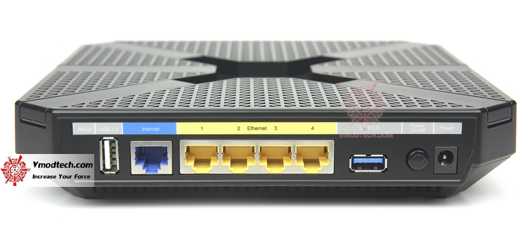 ด้าน หลังของ Router นั้นก็จะเป็นบรรดาพอร์ทเชื่อมต่อต่างๆ เด้านซ้ายสุดนั้นเป็นปุ่มรีเซต พอร์ท USB 2.0 พอร์ท WAN พอร์ท Gigabit LAN 4 ช่อง ช่องเสียบ USB 3.0 สวิทซ์ปิด/เปิด และขวาสุดเป็นช่องเสียบไฟ DC ขาเข้า