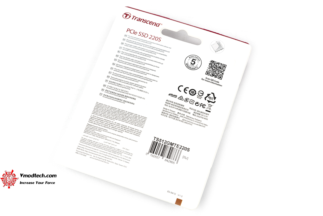 แพกเกจ Transcend PCIe SSD 220S 512GB นั้นมาแบบง่ายๆโดยตัว SSD นั้นจะถูกห่อหุ้มด้วยกระดาษแข็งเข้ารูป