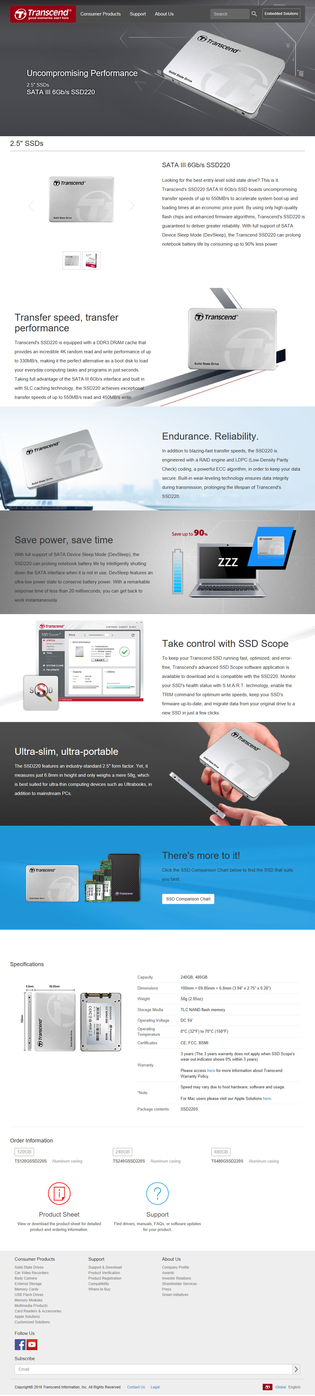 “SSD Transcend 220S” มีความจุให้เลือกใช้ 240 GB และ 480 GB มีขนาดเพียง 2.5 นิ้ว และน้ำหนักเพียง 58 กรัม มีการเชื่อมต่อแบบ SATA lll 6Gb/s ใช้ชิพควบคุมการทำงาน Silicon SM2256KAB Controller และ TLC NAND Flash Memory โดยมีลักษณะพิเศษดังนี้