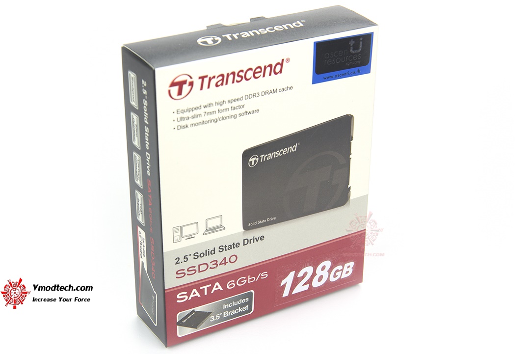รายละเอียดด้านหน้าและหลังกล่องใส่ Transcend SSD340 128GB