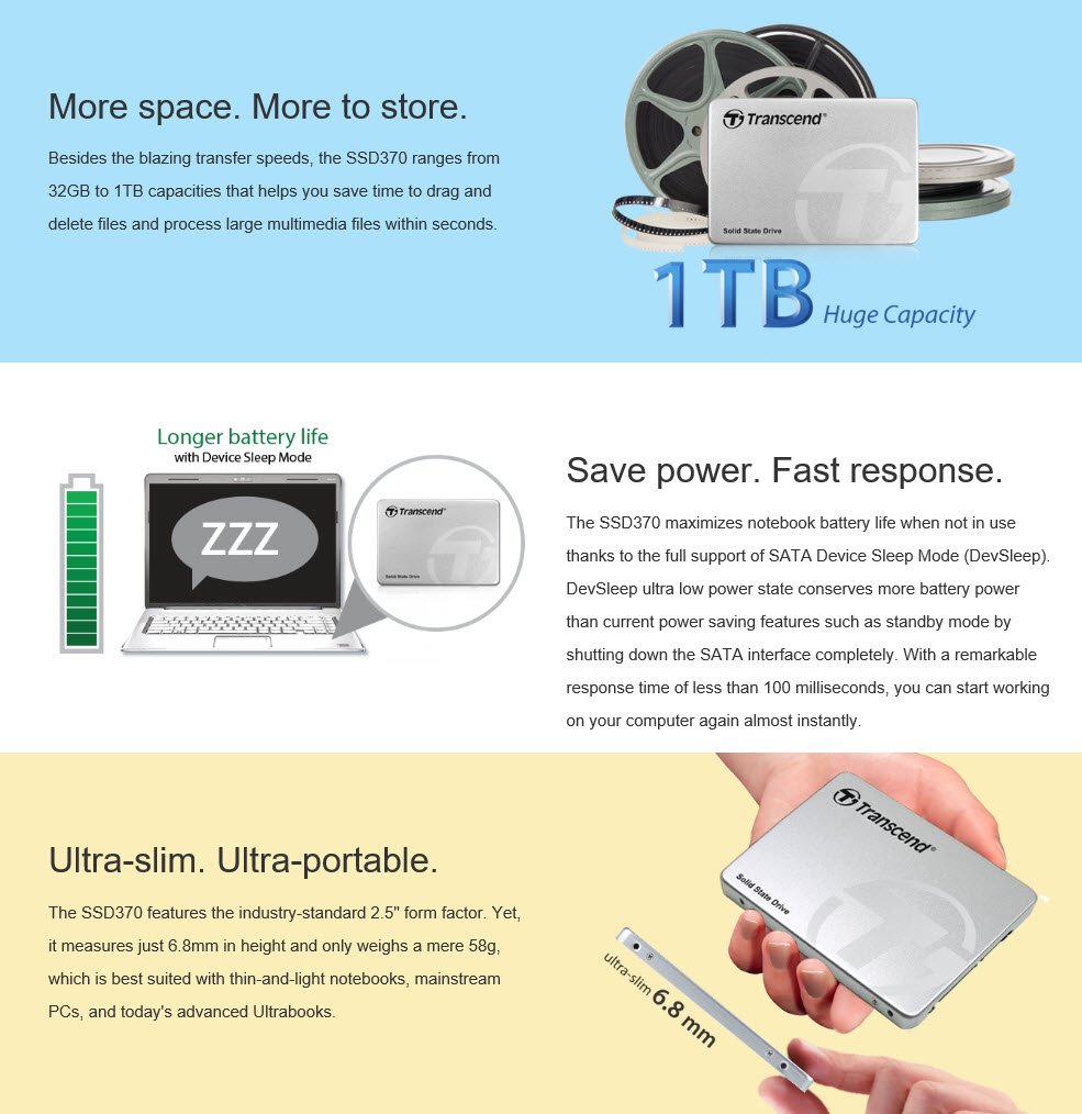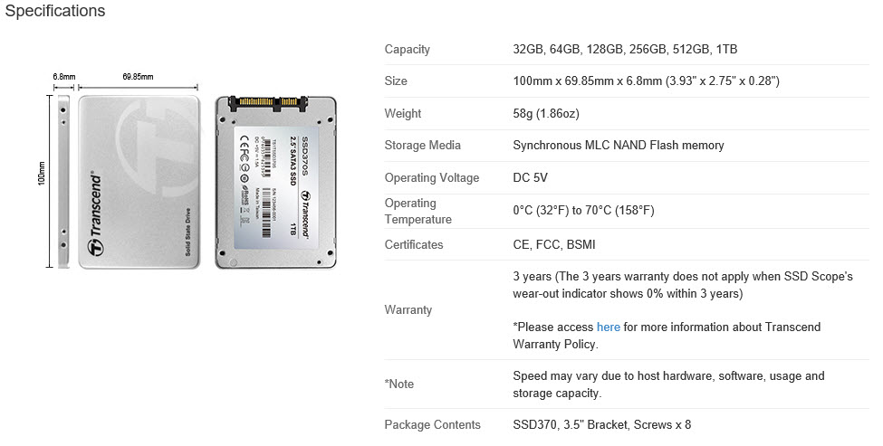 Transcend SSD370S ซีรีย์นั้นจะวางจำหน่ายทั้งหมด 6 ความจุดได้แค่ 32, 64, 128, 256, 512 และ 1000 กิ๊กกะไบท์ครับ ความเร็วในการอ่านและเขียนก็แปรไปตามขนาดความจุอย่างที่เราๆทราบกัน