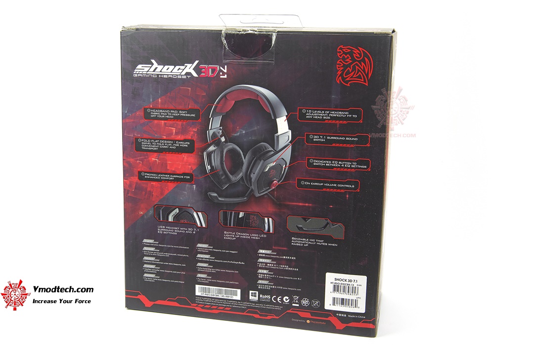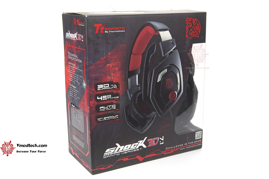 กล่องบรรจุนั้นออกแบบสบายๆด้วยโทนสีแดงจี๊ดจ๊าดครับ คุณสมบัติหลักๆของตัว Tt eSPORT SHOCK 3D 7.1 นั้นได้มีแสดงไว้บนกล่องเพื่อให้เลือกหาไม่ผิดวัตถุประสงค์การใช้งาน