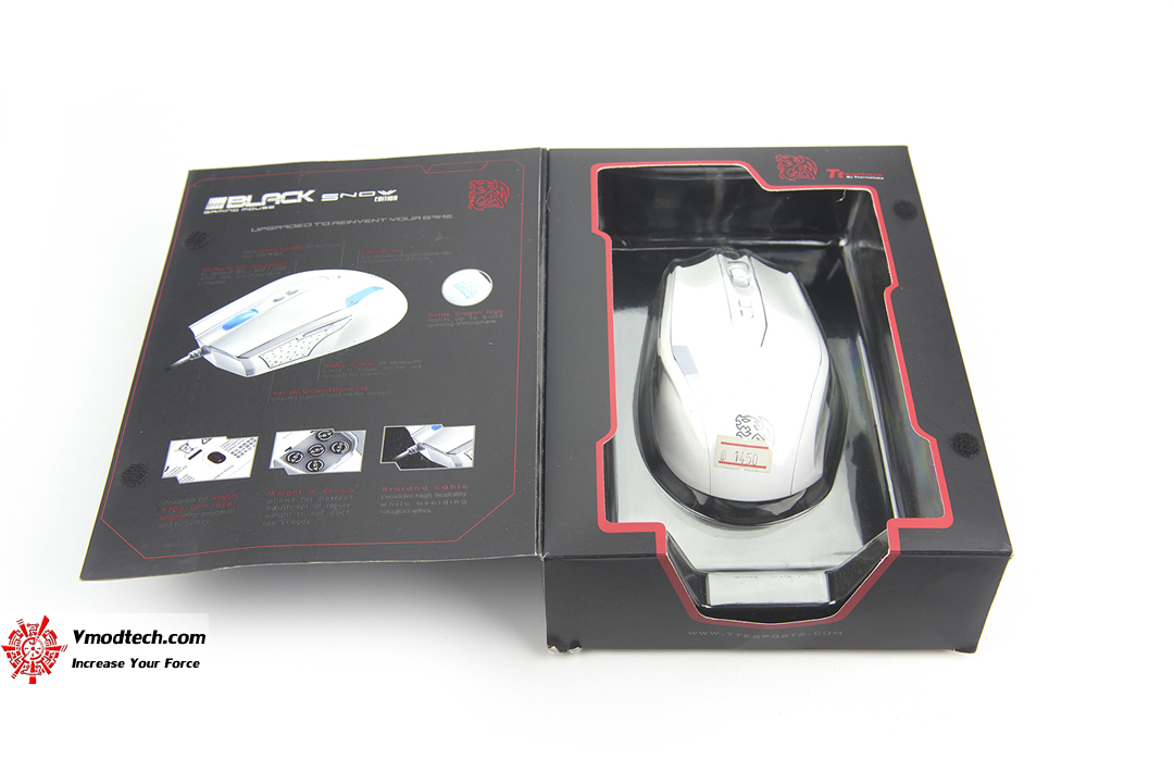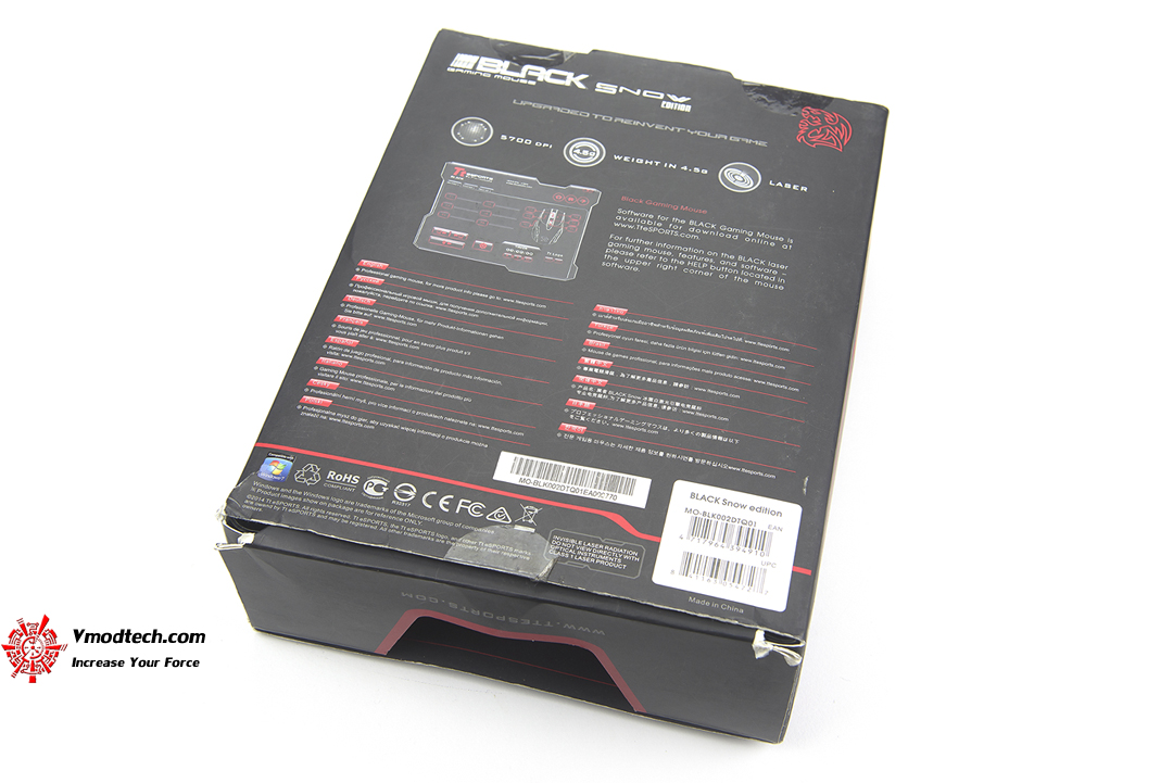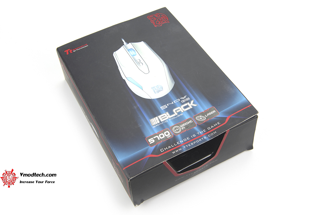รายละเอียดบนตัวกล่องของ Tt eSPORTS BLACK SNOW Edition ก็จะมีรายละเอียดต่างๆมาให้ได้ชมกันพอสมควร ตัวเมาส์นั้นจะมีเซนเซอร์แบบ Laser ที่มีความไวสูงสุดที่ 5700 DPI ครับ
