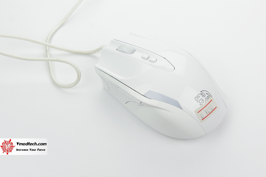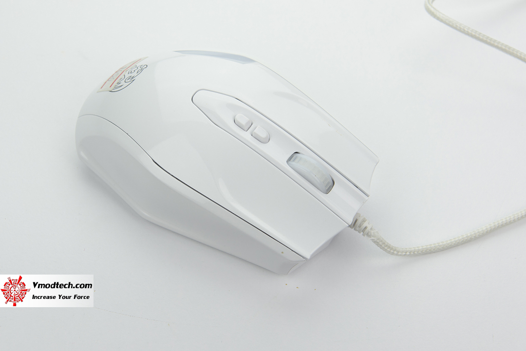 ตัวเมาส์นั้นไฉไลมาก สีขาวเคลือบเงามาอย่างมีสไตล์เลย มันถูกออกแบบมาเป็นพิเศษสำหรับคนถนัดขวา ตรงกลางเมาส์นั้นจะมีช่องสำหรับปล่อยให้แสงไฟจากในตัวเมาส์เรืองแสงออกมาด้วย