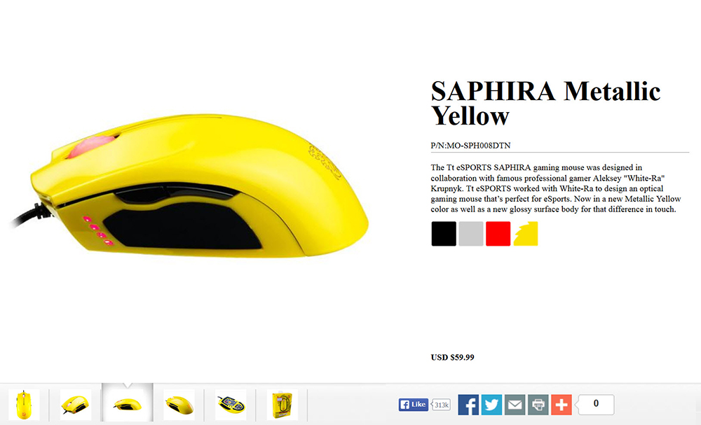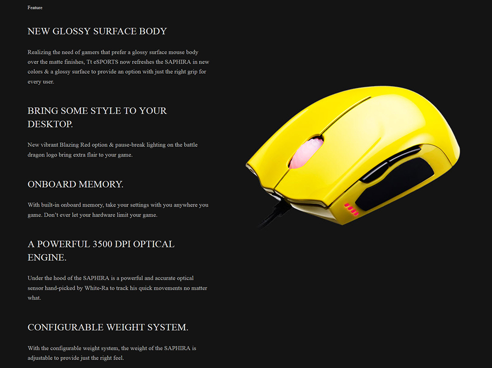Tt esports Saphira Metallic Yellow Gaming Mouse นั้นถูกออกแบบมาเป็นพิเศษสำหรับคอเกมส์ RTS/FPS ครับ ตัวเซนเซอร์นั้นมีความละเอียดมากถึง 3500 DPI ด้วยเซนเซอร์แบบออบติคอล มีสีสรรให้เลือกสี่สีคือ สีดำ สีคอมแบท ไวท์ สีเบลซซิ่ง เรด และสีที่กำลังรีวิวก็คือ เมททาลิก เยลโล่ ครับ