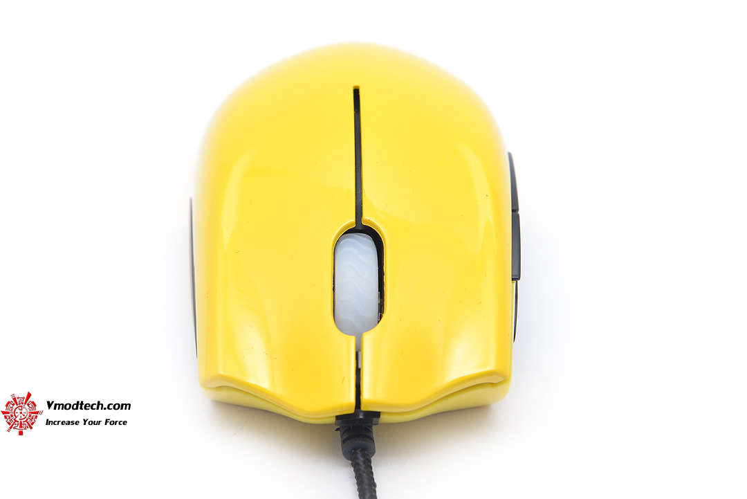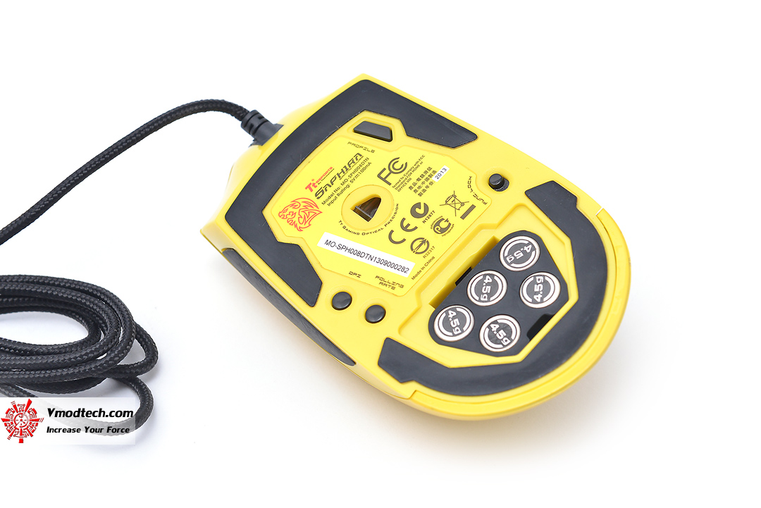 บริเวณด้านล่างครับจะเห็น feet เส้นบางๆ ไม่ทำให้ตัวเมาส์เกิดความเสียดทานมากนักเมื่อใช้งาน ตัวเมาส์นั้นสามารถปรับแต่งน้ำหนักโดยใช้ตุ้มน้ำหนักขนาด 4.5 กรัมโดยเราสามารถเลือกใช้งานได้ห้าตุ้มพร้อมๆกัน ส่วนปุ่มเล็กๆด้านใต้นี้ก็จะเป็นปุ่มปรับ DPI ปุ่มปรับ Polling Rate และปุ่มล๊อคฟังค์ชั่นทั้งสองเมื่อเราทำการปรับแต่งเสร็จและไม่อยากให้มีการไปเปลี่ยนโดยไม่ตั้งใจ