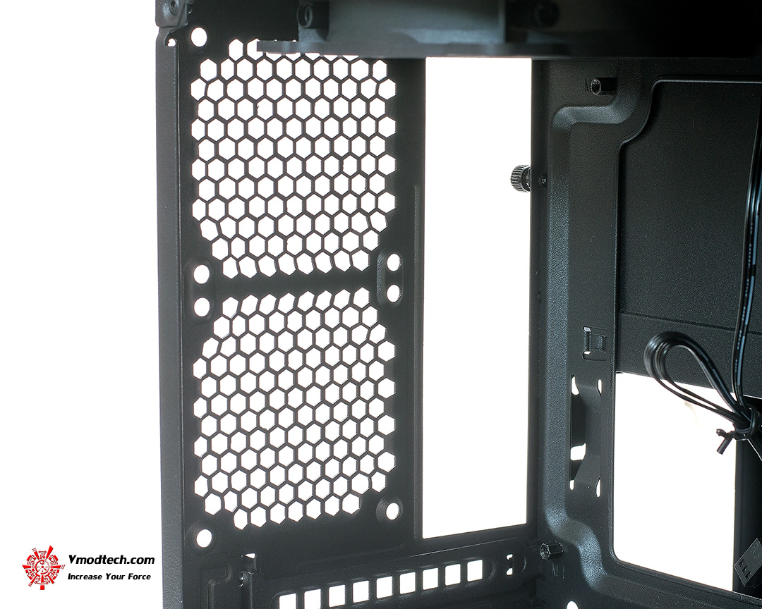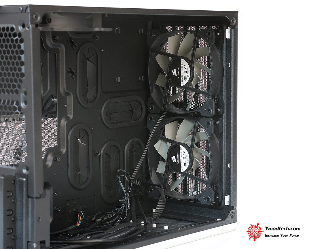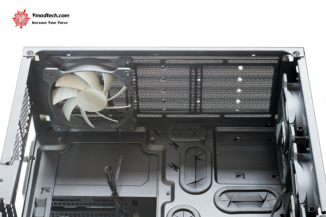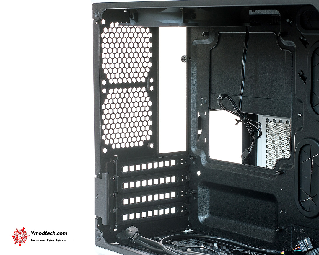 ด้านหน้าภายในโล่งสบายตาเมื่อไม่มี HDD Drive Cage พัดลม 120mm. 2 ตัวดูลมเย็นเข้าระบบเต็มๆครับ เย็นชุ่มช่ำ