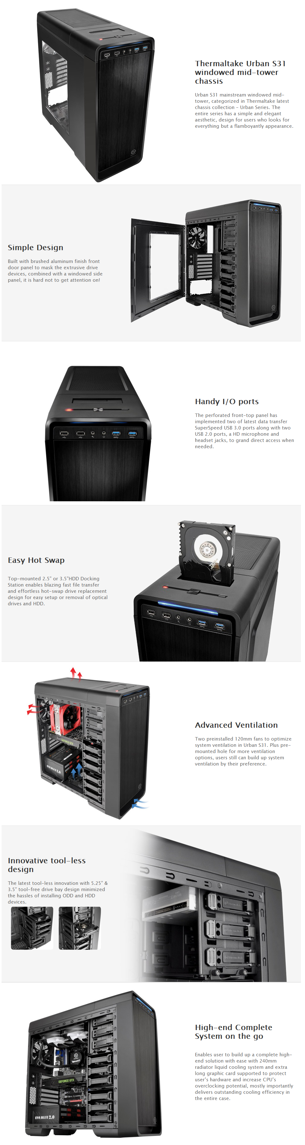 ……….สวัสดีครับวันนี้มาเปิดกล่องดูเคสกันอีกแล้วครับ กันเคสจาก Thermaltake รุ่น Urban S31 windowed mid tower chassis เป็นเคส Mid-Tower PC Case อีก 1 รุ่น ที่มีให้เลือกซื้ออยู่ขณะนี้นะครับ รูปร่างหน้าตาแรกพบเมื่อแกะกล่องออกมาดู ต้องบอกว่าถูกใจอีกแล้วครับ จะเป็นอย่างไรนั้น ช่วงนี้ไปชมรายละเอียดจากผู้ผลิตก่อนครับ
