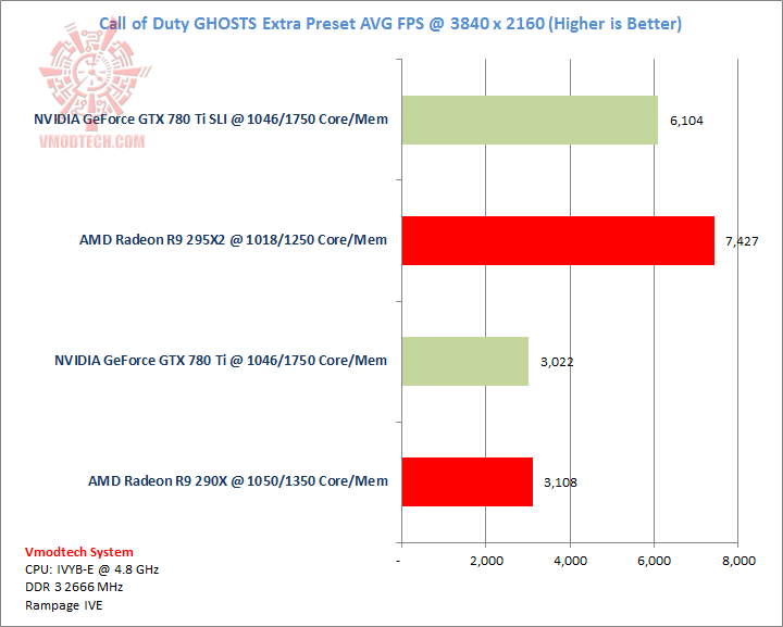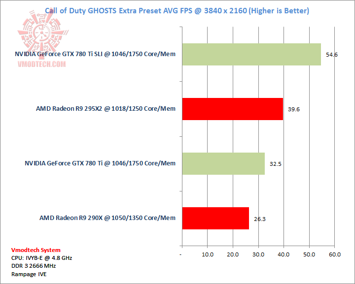Call of Duty Ghosts นั้นโหดมากสมกับเป็นเกมส์ที่ออกมาในปีนี้ครับ ตัวเกมส์เรียกแรมมาใช้งสูงสุดบน 295X2 ถึง 7.4 กิ๊กกาไบท์ แต่จะเห็นได้ว่าประสิทธิภาพของ GPU NVIDIA 780 Ti นั้นเหลือเฟือโดยสามารถเล่นได้ที่ประมาณ54 เฟรมต่อวินาทีและทิ้งห่างคู่แข่งอยู่ร่วม 15 เฟรมเลยครับ