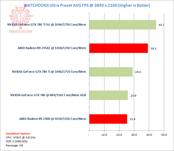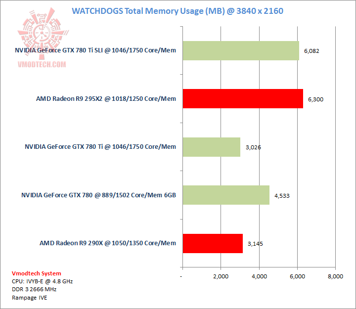 Watchdogs เกมส์ที่เพิ่งออกมาไม่นานมานี้ครับ ตัวเกมส์เรียกแรมการ์ดมาใช้งาน 6.3 กิ๊กบนการ์ด 295X2 และใกล้เคียงกันบนการ์ดคู่ GTX 780 Ti SLI แต่จะเห็นว่าพลังของค่ายเขียวนั้นสามารถรีดประสิทธิภาพและเฟรมเรทมากกว่านิดหน่อยครับ
