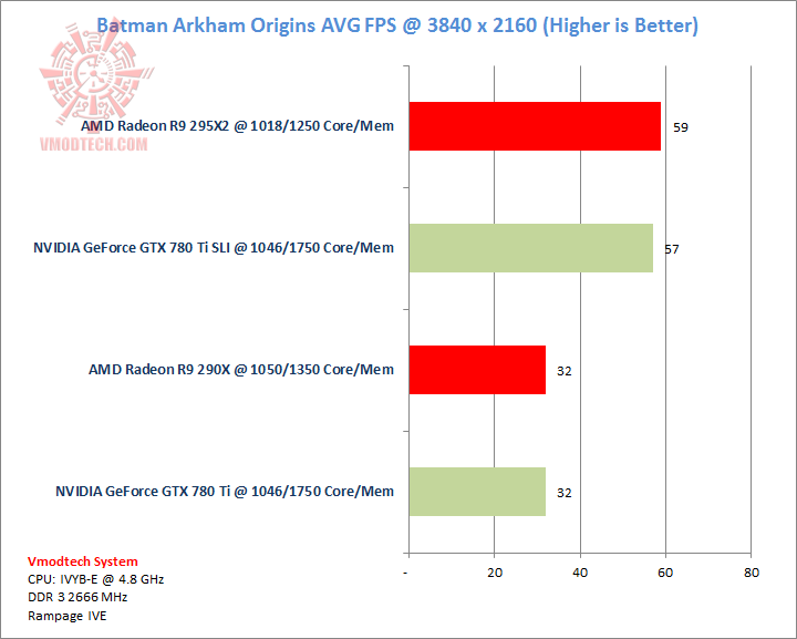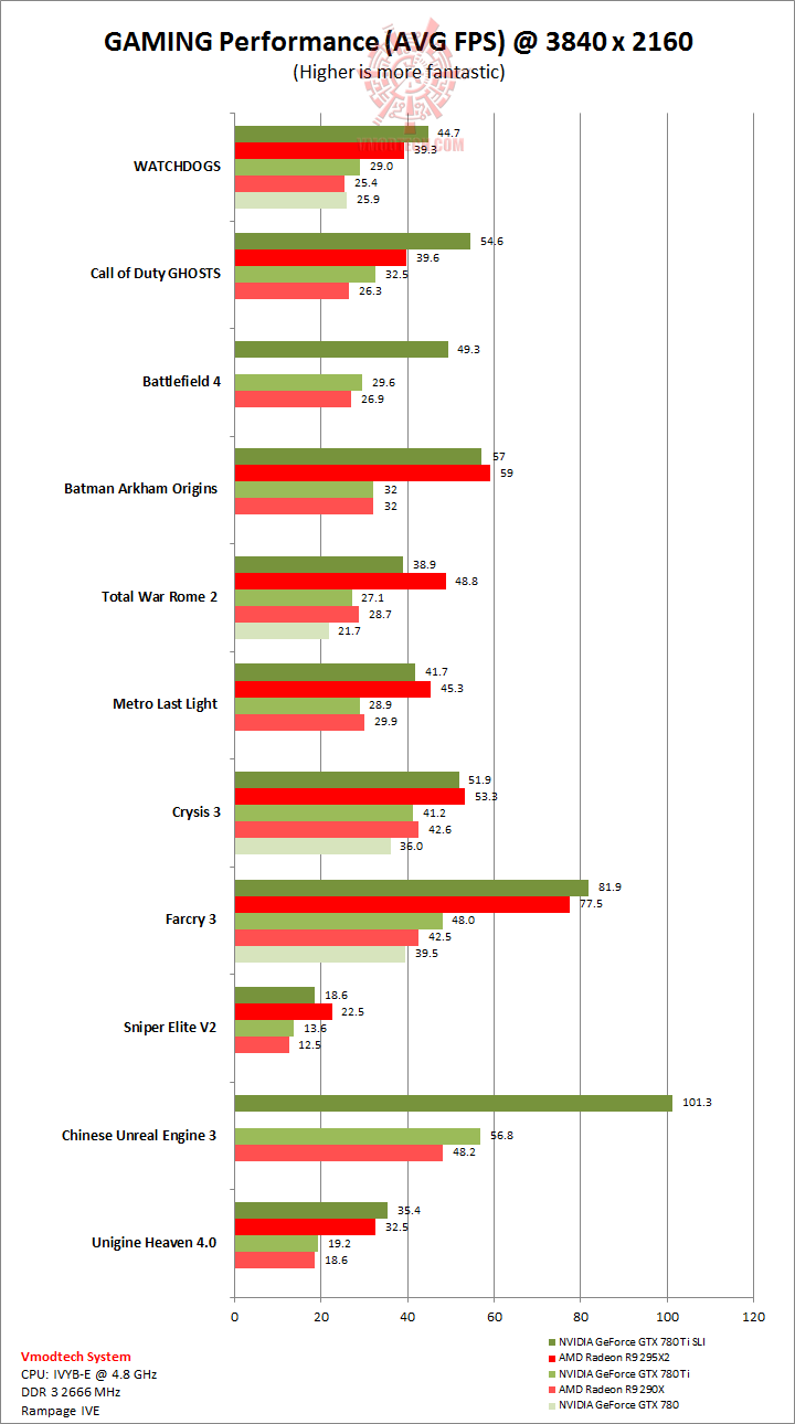 Call of Duty Ghosts นั้นโหดมากสมกับเป็นเกมส์ที่ออกมาในปีนี้ครับ ตัวเกมส์เรียกแรมมาใช้งสูงสุดบน 295X2 ถึง 7.4 กิ๊กกาไบท์ แต่จะเห็นได้ว่าประสิทธิภาพของ GPU NVIDIA 780 Ti นั้นเหลือเฟือโดยสามารถเล่นได้ที่ประมาณ54 เฟรมต่อวินาทีและทิ้งห่างคู่แข่งอยู่ร่วม 15 เฟรมเลยครับ
