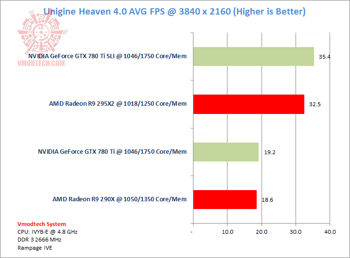 ประเดิมด้วย Heaven ครับ ในขณะทำการทดสอบที่ความละเอียด 3840 x 2160 นั้น การ์ดเขียวนำไปอยู่พอควร