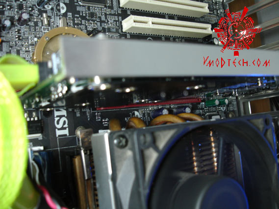 จุดอย่างหนึ่งที่ผมเจอมากับตัวเองคือบริเวณด้านหลังของการ์ดจอครับ ถ้าเล่นกับ Athlon 64 BIT อาจจะเจอปัญหาได้ครับสำหรับระบบระบายความร้อนเดิมๆ จะเป่าอัดลมร้อนใส่บริเวณด้านหลังการ์ดจอซึ่งในช่วงนั้นเป็นแรมครับ อาจจะทำให้ความเสถียรในการ OverClock ทำได้น้อยลงครับ ลองดูจากภาพข้างล่างดีกว่าครับ