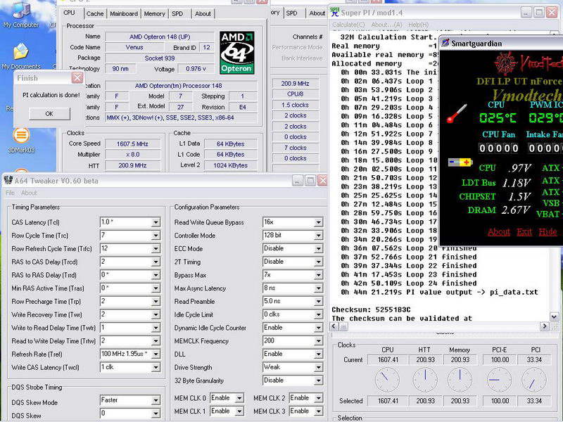งานนี้ผมไม่มีCPUทั่วไปแบบVenice3000+มาลองเป็นฐานข้อมูลด้วย เลยเอาOpty148ผมมาลดตัวคูณเป็น8แล้วใช้บัส200เป็น1.6GHz ต่อให้200MHzเลย ถือว่าต่อให้ตรงแรม 1.5-2-2-0 1T กับL2Cache 1MB อย่างละ100MHz แล้วกันนะครับ ที่ความเร็วนี้ไม่มีอะไรจะโชว์เลย เบื่อๆเลยโชว์VCORE 0.976 V. ให้ดูพลางๆแล้วกัน งานนี้พวกLaptop เห็นไฟต้องอายม้วนเลยครับ อิอิ