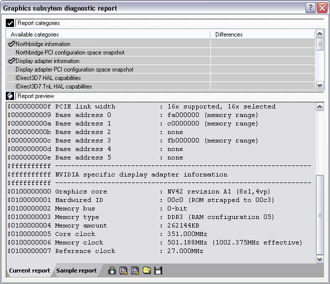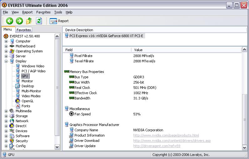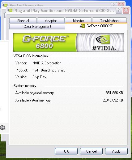 แรมก็แจ้งเป็น256-bit ถูกต้องตามสเป็คที่ผมว่า ซึ่งผมก็นั่งๆดูแล้ว และจากความเร็วสูงสุดของGPUที่ทำได้ ผมคิดว่าRivaTunerน่าจะรายงานผิดพลาดนะครับ จริงๆแล้วชิปตัวนี้น่าเป็นNV41 หรือ GF6800 PCI-E 12/5ท่อ ที่ถูกนำมาปิดท่อ มากกว่าจะเป็นNV42 หรือ GF6800GS 12/5ท่อ มาปิดท่อออกขายเป็นรุ่นนี้ อย่างที่หลายๆท่านเข้าใจกันนะครับ