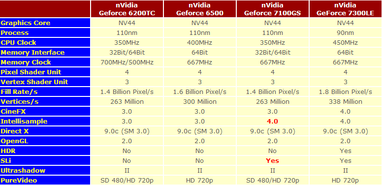 GeForce 7100 GS นั้นได้ใช้รหัสในการพัฒนาคือ NV44 อ้าวว งงๆกันเข้าไปดิครับ(ตอนแรกผมยังงงๆเลย) มันคือรหัสของ GF6200TC สิครับ ก็ตอบกันเลยครับว่าใช่ อิอิ GF7100GS นั้นพกพาระบบ TC (Turbo Cache) มาด้วย โดยใน XFX GF7100GS ตัวที่ผมจะพามารู้จักวันนี้รองรับถึง 512 MB กันเชียวกับ และ GF7100GS เป็นตัวที่พัฒนาต่อยอด จาก 7300LE (7300LE ก็ต่อยอดมาจาก 6200TC ครับ) จึงเลยเป็นที่มาของ GF7100GS CodeName NV44 นั้นเอง ลองดูจากตารางเปรียบเทียบด้านล่างได้ครับ