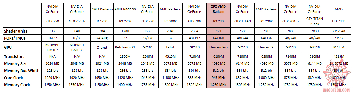 จากตาราง XFX R9 290 4GB GDDR5 นั้นจะมีสเปกความเร็ว Core และ memory ที่เหมือนกับ AMD R9 290 Ref. ทั่วไปครับอยู่ที่ความเร็ว Core 947Mhz Memory 1250Mhz สเปกต่างๆนั้นเหมือนกันหมดครับ