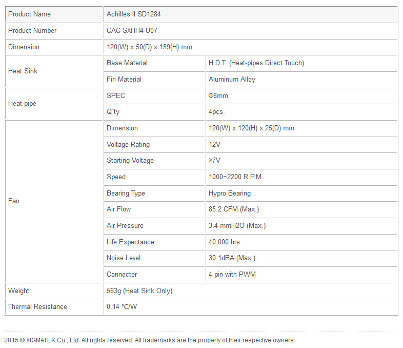……….สวัสดีครับ วันนี้มี CPU Cooler จาก XIGMATEK มาฝากกันอีกแล้วครับ กับ Xigmatek AchillesII SD1284 รูปลักษณ์ภายนอกก็เป็น CPU Cooler 4 Heat-pipe ทำจาก Aluminum Alloy เงางามทั้งตัว หน้าสัมผัส Heat-pipe สัมผัสโดยตรงกับกระดอง CPU ประสิทธภาพการระบายความร้อนจะเป็นเช่นไรไปชมพร้อมๆกันครับ แต่ก่อนอื่นต้องไปชมรายละเอียดจากเว็บไซต์ผู้ผลิตกันก่อนครับ