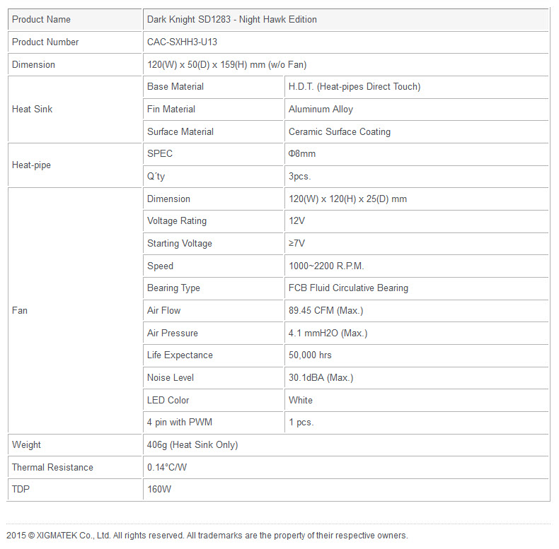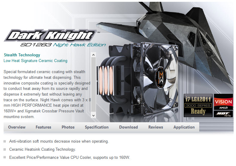……….สวัสดีครับ วันนี้มี CPU Cooler จาก XIGMATEK มาฝากกันอีกแล้วครับ กับ Xigmatek Dark Knight SD1283 Night Hawk Edition รูปลักษณ์ภายนอกก็เป็น CPU Cooler 3 Heat-pipe สีดำด้านทั้งตัวครับ หน้าสัมผัส Heat-pipe สัมผัสโดยตรงกับกระดอง CPU ประสิทธภาพการระบายความร้อนจะเป็นเช่นไรไปชมพร้อมๆกันครับ แต่ก่อนอื่นต้องไปชมรายละเอียดจากเว็บไซต์ผู้ผลิตกันก่อนครับ