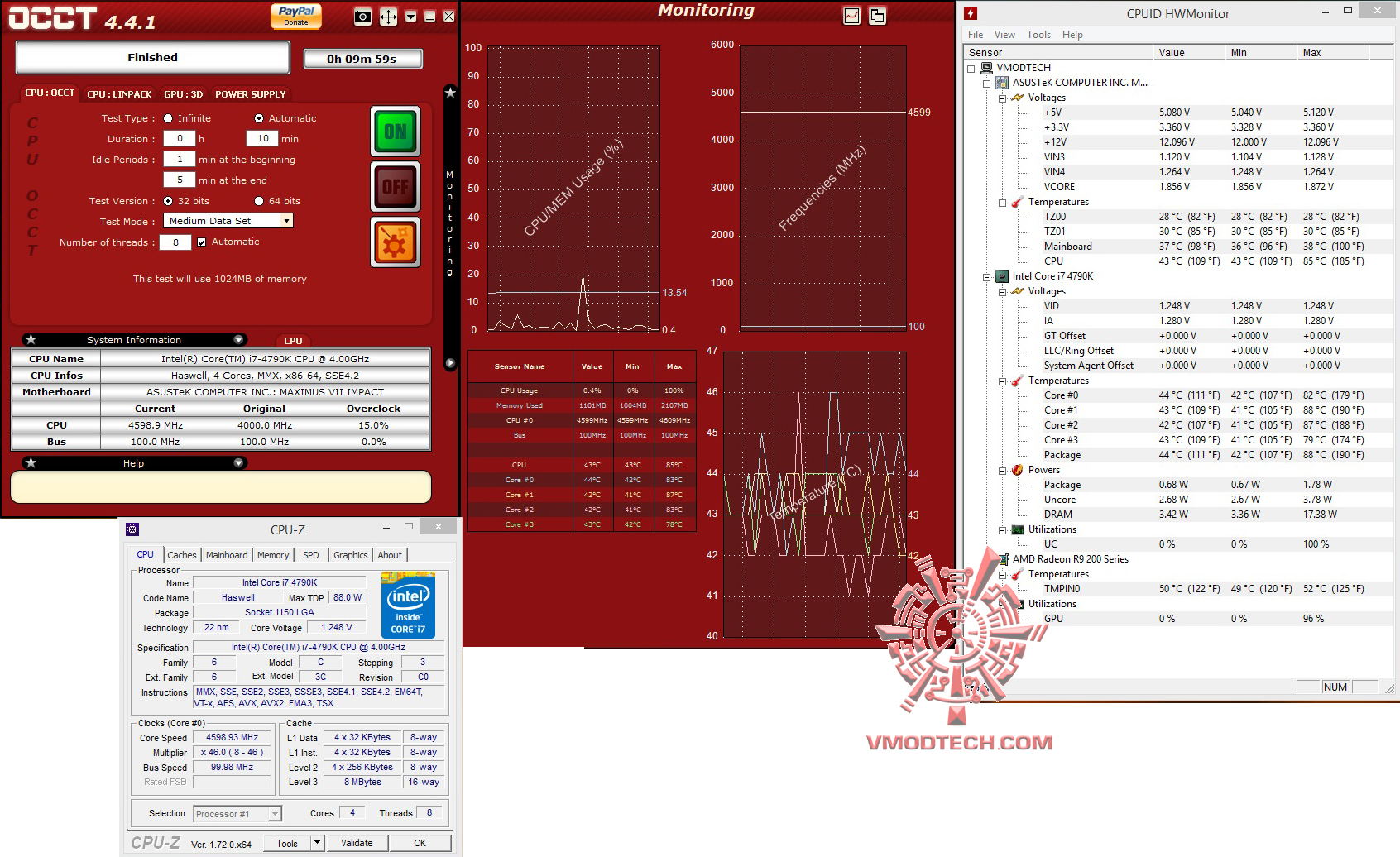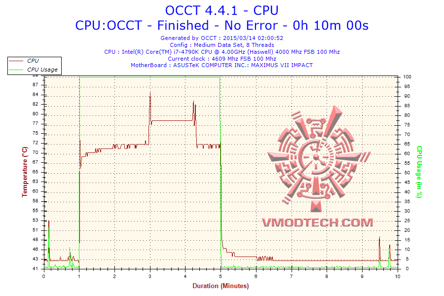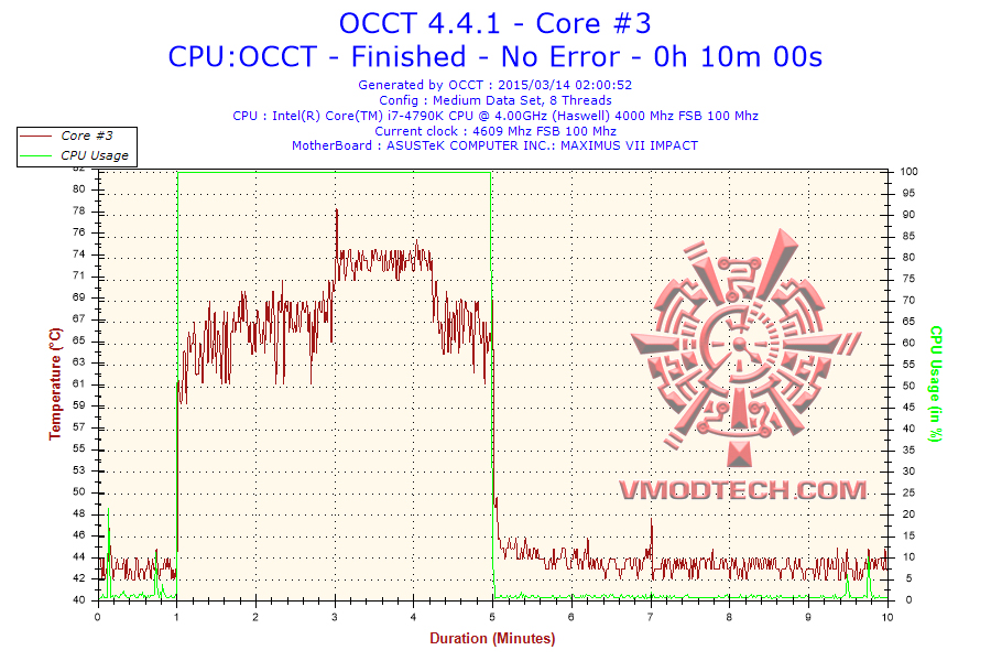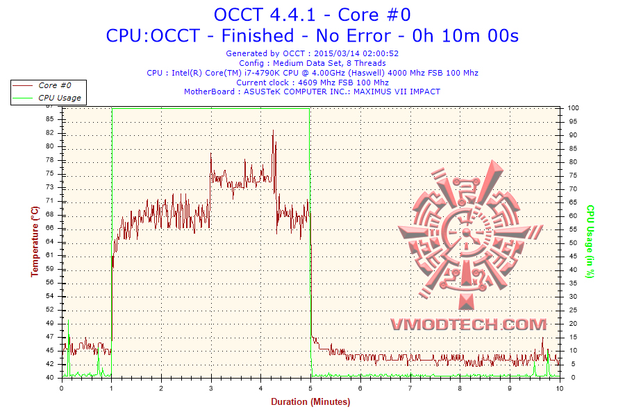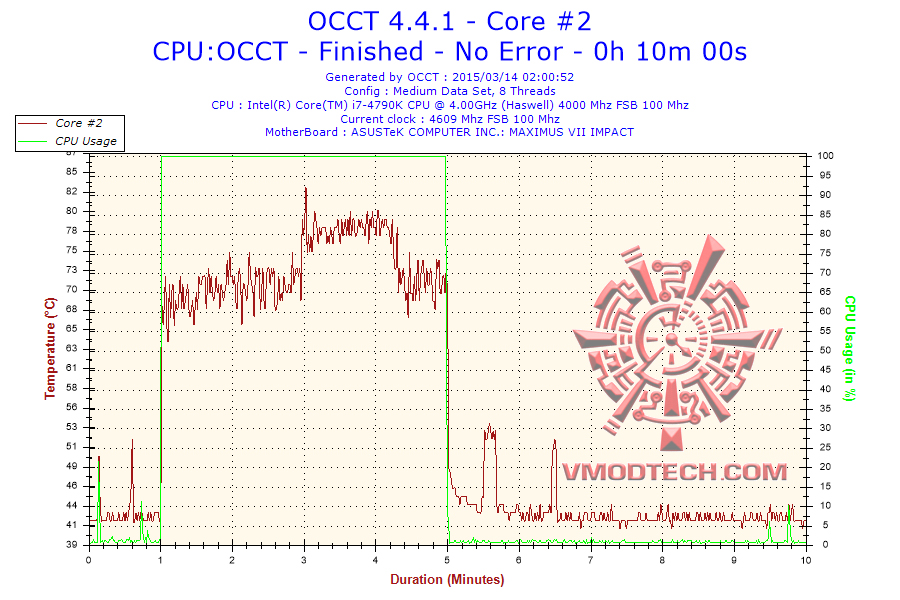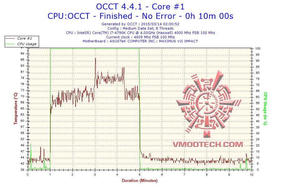 เทสที่สอง โอเวอร์คลีอกที่ความเร็ว 4.6Ghz Idel อยู่ที่ 41องศาฯ เท่านั้นครับในคอร์ 1-4 ส่วนสภานะฟูลโหลดอยู่ที่ 79-88 องศาฯ ในคอร์ 1-4 เท่านั้นในค่า CPU Core Temp ในห้องอุณหภูมิที่ 32-33องศาฯ โอเวอร์คล๊อกเทสกันแบบใช้งานกันจริงๆเลยครับในหน้าร้อนห้องธรรมดา ใช้งานได้ดีทั้งสถานะเดิมๆและโอเวอร์คล๊อกกันได้สบายๆเลยครับสำหรับ ZALMAN CNPS 10X Optima Shark’s Fin Blade CPU Cooler ทำผลงานในการโอเวอร์คล๊อกกันได้แบบสบายๆ