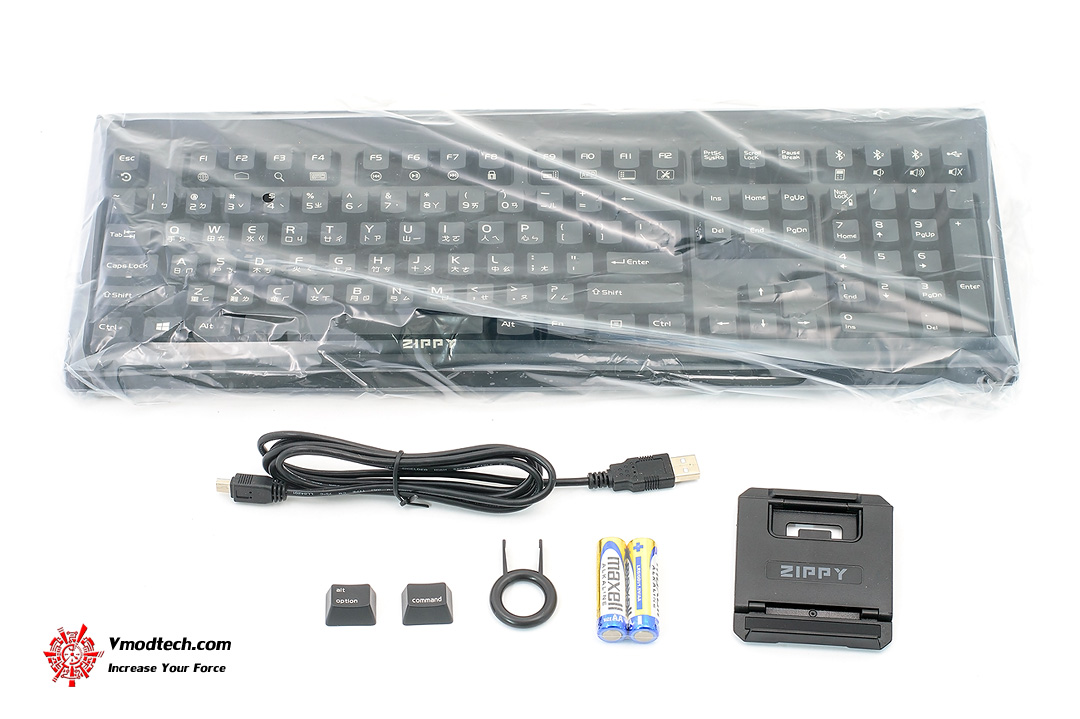 ของภายในกล่องก็มี ตัว Keyboard, สาย USB สำหรับต่อเข้า PC, ปุ่มสำรอง 2 ปุ่ม พร้อมที่ถอดปุ่ม, ถ่ายขนาด AA และสุดท้าย ฐานรอง Tablet and Smartphone