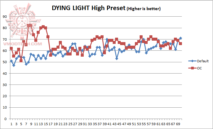 เกมส์ที่น่าสนใจอย่าง Dying Light นั้น ตัวการ์ดสามารถแสดงผลแบบปรับสุดบนความละเอียด FULL HD ได้ที่ 62.59 เฟรมต่อวินาที และเมื่อทำการโอเวอร์คล๊อกเพิ่มขึ้นไปค่าเฉลี่ยก็เพิ่มขึ้นไปอีกเล็กน้อยที่69.07 เฟรมต่อวินาทีครับ
