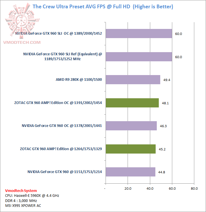 GTX 960 นั้นมีพลังที่จะขับเคลื่อนเกมส์ดังๆเหล่านั้นได้เป็นอย่างดีที่เฟรมเรทเฉลี่ย 60 เฟรมต่อนาที ซึ่งถ้ามองกันตรงๆคือมากกว่า GTX 660 ที่ได้เพียงไม่เกิน 40 เฟรม เมื่อเปรียบเทียบ GTX 960 กับ GTX 660 นั้นจะเห็นได้ว่า GTX 960 นั้นมีการพัฒนาต่อยอดได้อย่างสมบูรณ์แบบ เพียบพร้อมไปด้วยคุณสมบัติพิเศษๆเช่น VXGI และ MFAA ซึ่งถือว่าเป็นเทคโนโลยีลบรอยหยักของเจนเนอร์เรชั่นต่อไปซึ่งจะพบได้บน DirectX ตัวที่กำลังเปิดตัวจาก Microsoft