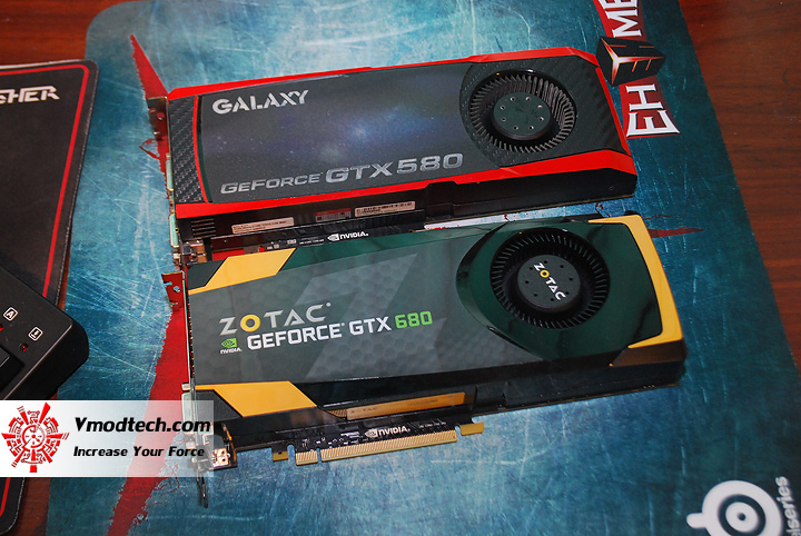 จับมาเทียบกับกราฟฟิกการ์ดรุ่นใหญ่สุดเจนเนอเรชั่นก่อนอย่าง GTX580 ครับ จะเห็นว่า GTX680 นั้นจะสั้นกว่านิดหน่อยและตัวโครงสร้างของฝาครอบนั้น จะไปคล้ายกับฝาของ GTX470 ด้วย