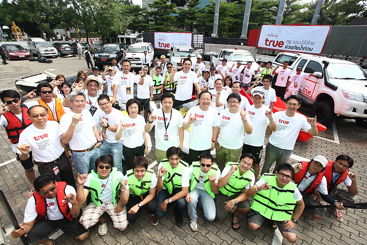 ตั้งแต่เริ่มสถานการณ์น้ำท่วมในเดือนกรกฎาคมที่ผ่านมาจนถึงปัจจุบัน กลุ่มผู้บริหารและพนักงานทรูคอร์ปอเรชั่นได้เดินหน้าให้ความช่วยเหลือพนักงานและครอบครัว พัยธมิตรคู่ค้าและผู้ประสบอุทกภัยในพื้นที่ต่างๆ จนทำให้เกิดแรงบันดาลใจแก่กลุ่มผู้บริหาร จัดตั้งทีม TRUE SEARCH & RESCUE ขึ้นภายใต้โครงการ “ทรู รวมน้ำใจ ช่วยภัยน้ำท่วม” โดยได้รวบรวมและฝึกอบรมกลุ่มพนักงานจิตอาสา เพื่อภารกิจสำคัญในการค้นหาและช่วยเหลือผู้ประสบภัยในพื้นที่และชุมชนที่เข้าถึงยากทั้งกรุงเทพฯ และปริมณฑล ทั้งยังส่งมอบความช่วยเหลืออื่นๆ และถุงยังชีพ อีกทั้งอพยพพนักงาน รวมถึงชาวบ้านในพื้นที่ดังกล่าวออกจากจุดเสี่ยงภัย