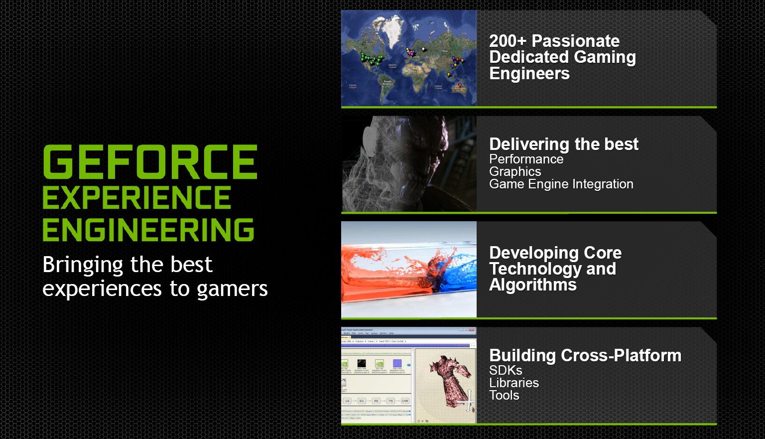 NVIDIA นั้นมีวิศวกรกว่า 200 คนที่ทำงานสร้างระบบขับเคลื่อนเกม กราฟฟิค เพื่อสมรรถนะที่ดีที่สุด สร้างอัลกอริทึมของระบบกราฟฟิค เกม SDK ที่สามารถใช้งานข้ามแพลตฟอร์มกันได้ และ libraries ตลอดจนเครื่องมือ ซึ่งนั้นรวมถึงหน่วยงานทดสอบของบริษัทที่มีอยู่ด้วยกันถึง 3 แห่ง โดยแห่งแรกนั้นตั้งอยู่ที่ Moscow โดยวิศวกรทดสอบจะทำงานเพื่อปรับปรุงสมรรถนะของอุปกรณ์เกมของ NVIDIA โดยทำการรันการทดสอบสมรรถนะ และสร้างเครื่องมือทดสอบ ซึ่งพวกเขา ไม่ได้เกิดมาเพื่อเล่นเกม แต่โฟกัสไปในเรื่องของการปรับปรุงสมรรถนะให้ดีที่สุด