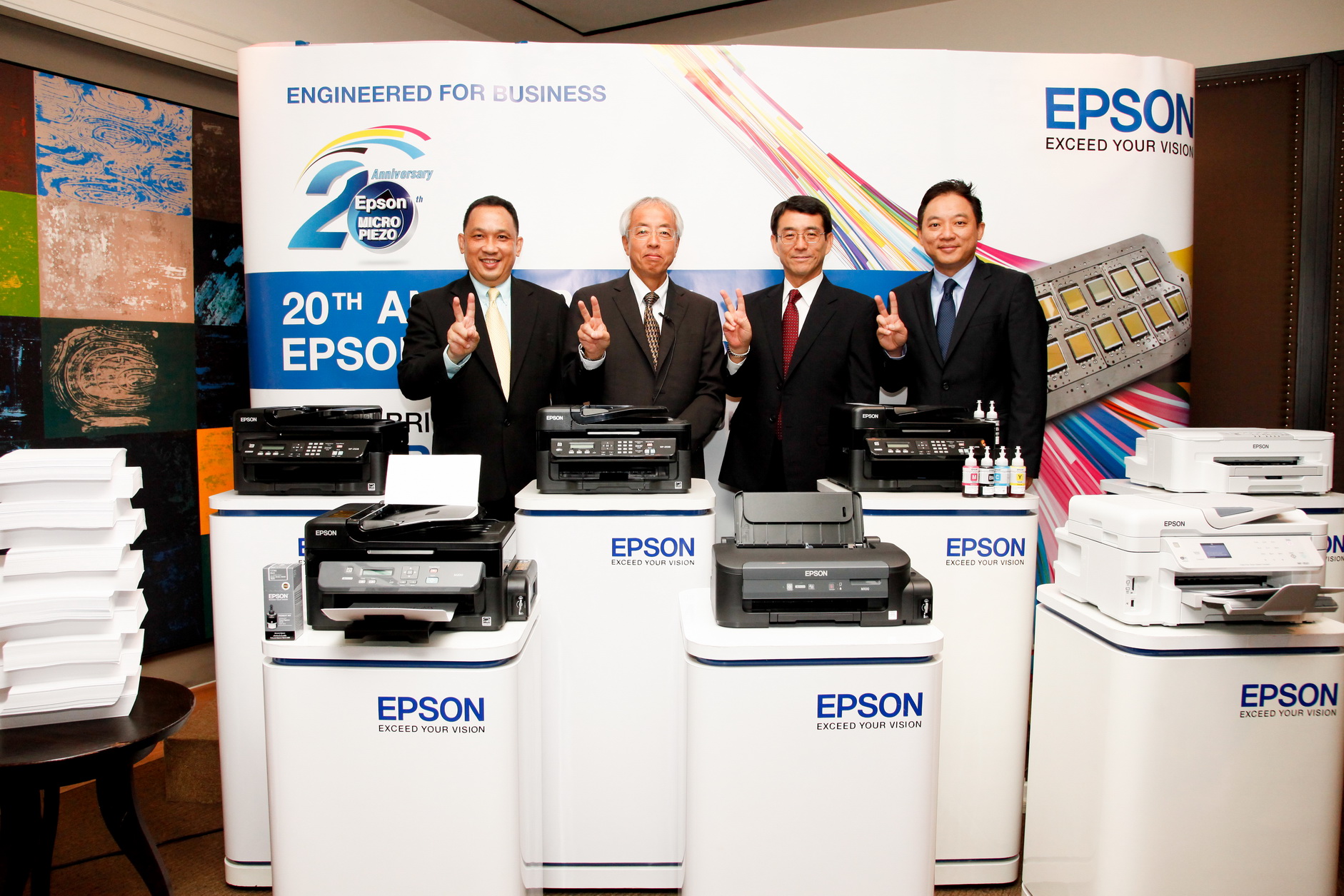 มร. โคอิชิ เอนโด ผู้อำนวยการบริหาร เอปสันเอเชียใต้และเอเชียตะวันออกเฉียงใต้ (ที่ 2 จากซ้าย), หนึ่งในวิศวกรผู้คิดค้นพัฒนาเทคโนโลยีหัวพิมพ์ไมโคร ปิเอโซ ซึ่งใช้ในพรินเตอร์เอปสันทุกขนาด ตลอด 20 ปีที่ผ่านมา ตั้งแต่รุ่นเล็กจนถึงรุ่นใหญ่ให้เกียรติเผยวิสัยทัศน์ในงาน “20th Aniverary Epson Micro Peizo” ถึงก้าวต่อไปของเทคโนโลยีไมโคร ปิเอโซ พร้อมเปิดตัวสินค้าใหม่ ซึ่งตอบโจทย์ความต้องการใช้งานที่หลากหลายยิ่งขึ้น โดยมี มร. ฮิโรกิ ยามาโมโตะ ผู้อำนวยการ เอปสันเอเชียใต้และเอเชียตะวันออกเฉียงใต้ (ที่ 3 จากซ้าย), นายอนันต์พล นนทพันธุ์ ผู้จัดการทั่วไป ด้านการบริการและบริหารองค์กร (ซ้ายสุด) และนายยรรยง มุนีมงคลทร ผู้จัดการทั่วไป ด้านการขายผลิตภัณฑ์ และการตลาด (ขวาสุด) ร่วมงานครั้งนี้