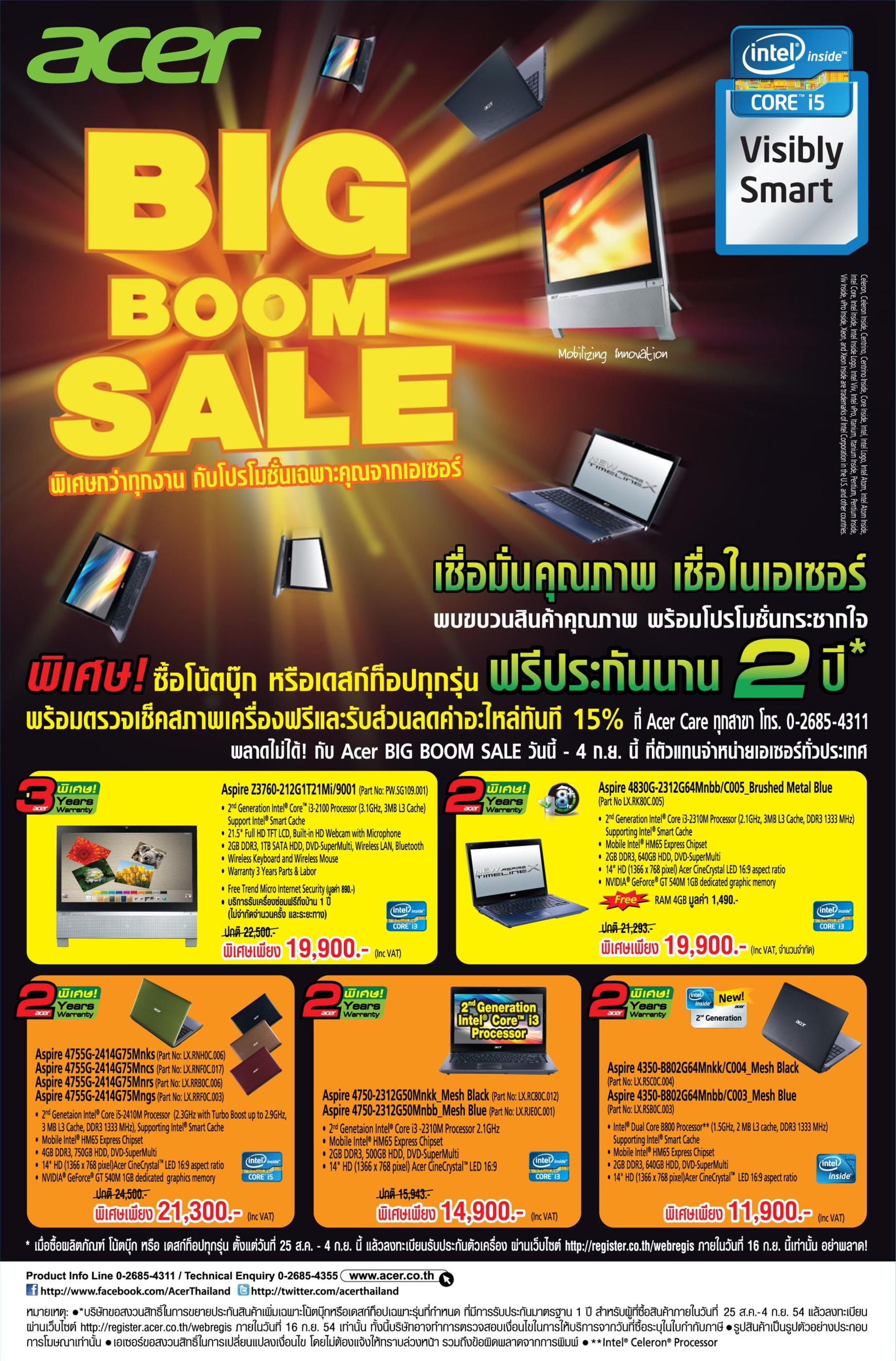 กรุงเทพฯ: 26 สิงหาคม 2554: บริษัท เอเซอร์ คอมพิวเตอร์ จำกัด ผู้นำอันดับหนึ่งในตลาดคอมพิวเตอร์โดยรวมในประเทศไทย จัดราคาโปรโมชั่นพร้อมเพิ่มความพิเศษกว่างานใด เพียงซื้อโน้ตบุ๊กหรือเดสก์ท๊อปทุกรุ่น รับฟรี!!! ประกันนาน 2 ปี พร้อมตรวจเช็คสภาพเครื่องฟรีและรับส่วนลดค่าอะไหล่ทันที 15% ที่เอเซอร์ แคร์ทุกสาขา เมื่อซื้อสินค้าในงาน Acer BIG BOOM SALE ตั้งแต่วันนี้ - 4 ก.ย. นี้ ที่ตัวแทนจำหน่ายเอเซอร์ทั่วประเทศ และลงทะเบียนรับประกันตัวเครื่องผ่านเว็บไซต์ http://register.co.th/webregis ภายในวันที่ 16 ก.ย. ศกนี้
