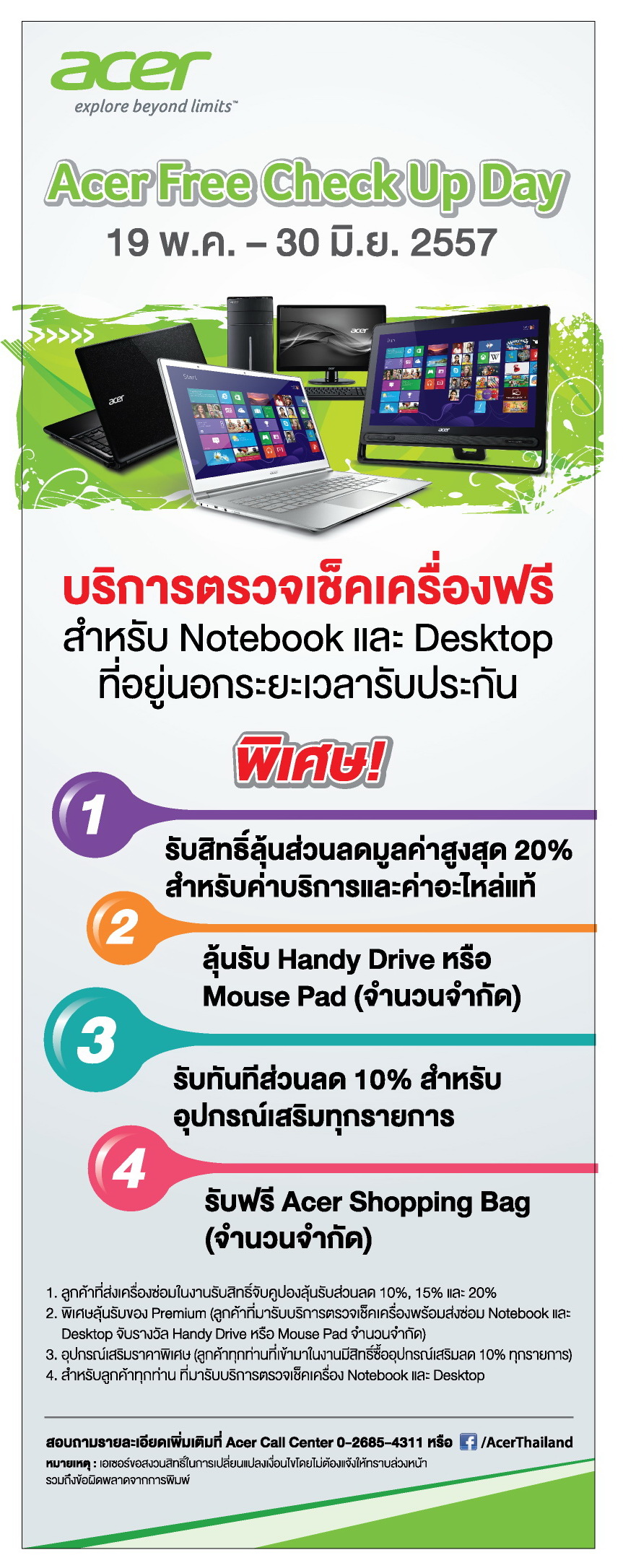 บริษัท เอเซอร์ คอมพิวเตอร์ จำกัด จัดบริการเด็ด โปรโมชั่นดี เอาใจลูกค้าด้วยบริการตรวจเช็คเดสก์ท็อป และโน้ตบุ๊ค ที่อยู่นอกระยะเวลาประกัน ฟรี! ในงาน Acer Free Check Up Day พร้อมรับของพรีเมียมจากเอเซอร์ ฟรี!! ทันที และส่วนลด 10% สำหรับซื้อสินค้าอุปกรณ์เสริม (Acer Accessories) ต่างๆ ทุกรายการ พิเศษสำหรับกรณีต้องส่งเครื่องซ่อม ลูกค้ารับสิทธิพิเศษในการลุ้นรับส่วนลดค่าบริการและอะไหล่สูงสุดถึง 20% พร้อมรับของรางวัลเพิ่มเติม ได้ตั้งแต่วันที่ 19 พฤษภาคม – 30 มิถุนายน 2557 ที่ศูนย์บริการเอเซอร์ทั้ง 14 สาขา ทั่วประเทศ (ที่ตั้งศูนย์บริการเอเซอร์) สอบถามข้อมูลเพิ่มเติมได้ที่เอเซอร์ คอลล์ เซ็นเตอร์ โทรศัพท์ 02-685-4311 หรือคลิกที่ www.acer.co.th / www.facebook.com/AcerThailand