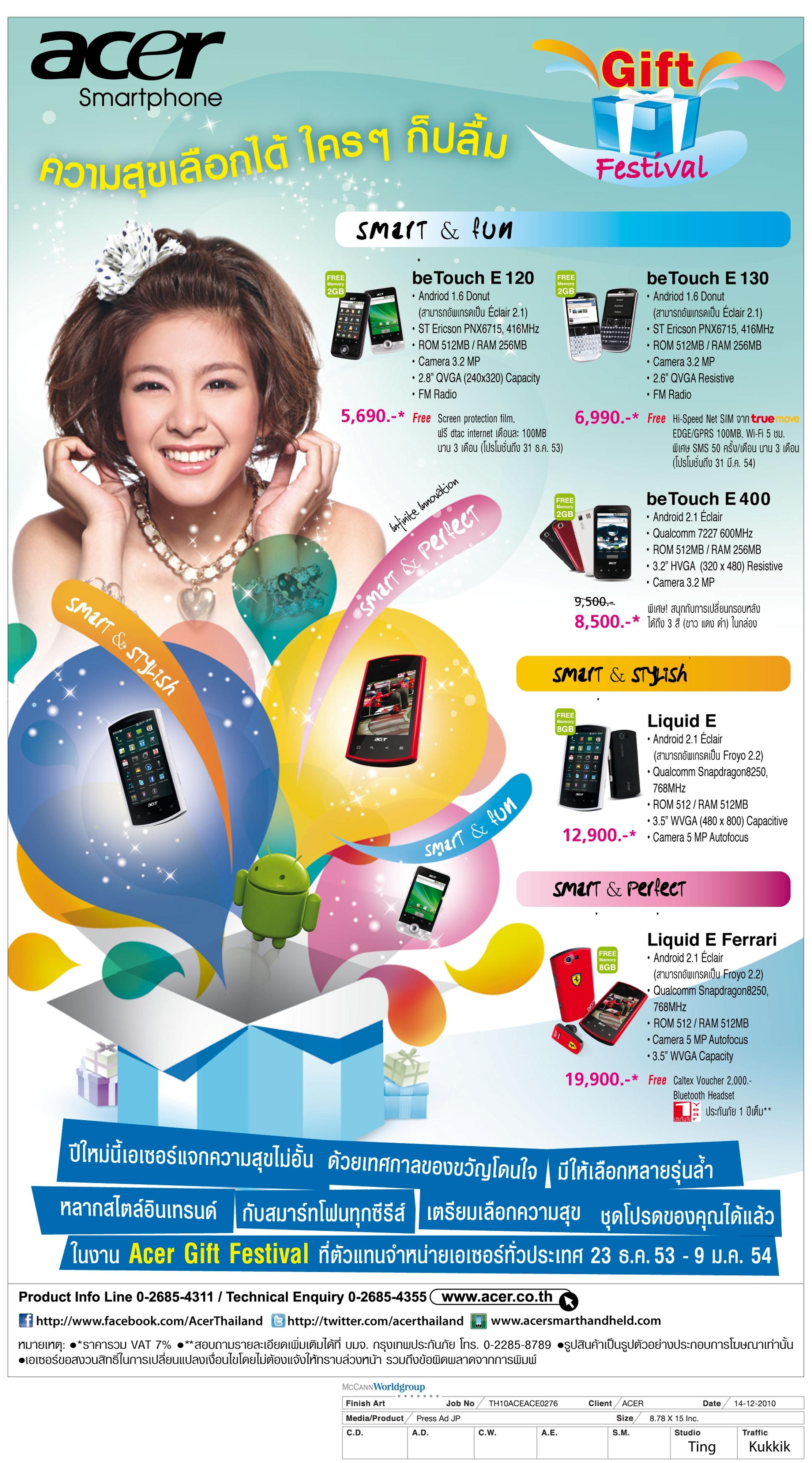 6. สมาร์ทโฟน Liquid E Ferrari กับระบบปฏิบัติการ Android 2.1 Éclair (สามารถอัพเกรดเป็น Android 2.2 Froyo ฟรี ที่ศูนย์บริการเอเซอร์) หน้าจอระบบสัมผัสแบบ capacitive ขนาด 3.5″ WVGA ความละเอียด 480×800 พิกเซล หน่วยประมวลผลกลาง Qualcomm Snapdragon 8250, 768 MHz. หน่วยความจำแรม 512MB หน่วยความจำรอม 512MB รองรับการ์ดหน่วยความจำ Micro SD สูงสุด 32 GB กับราคาพิเศษสุด 19,900 บาท (ราคารวม Vat 7%) พร้อมรับฟรี Caltex Voucher 2,000 บาท และ Bluetooth Headset พร้อมประกันอุบัติเหตุและวินาศภัยฟรี 1 ปีเต็ม สอบถามรายละเอียดเพิ่มเติมได้ที่ บมจ. กรุงเทพประกันภัย โทร 02-285-8789