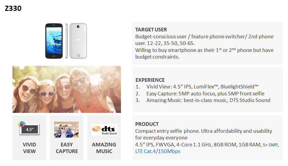 Acer Liquid Z330 สมาร์ทโฟน ดีไซน์งดงาม สเปคจี๊ดจ๊าด กับจอ IPS ขนาด 4.5 นิ้ว กล้องหน้า 5 MP ขา Selfie ไม่ควนพลาด