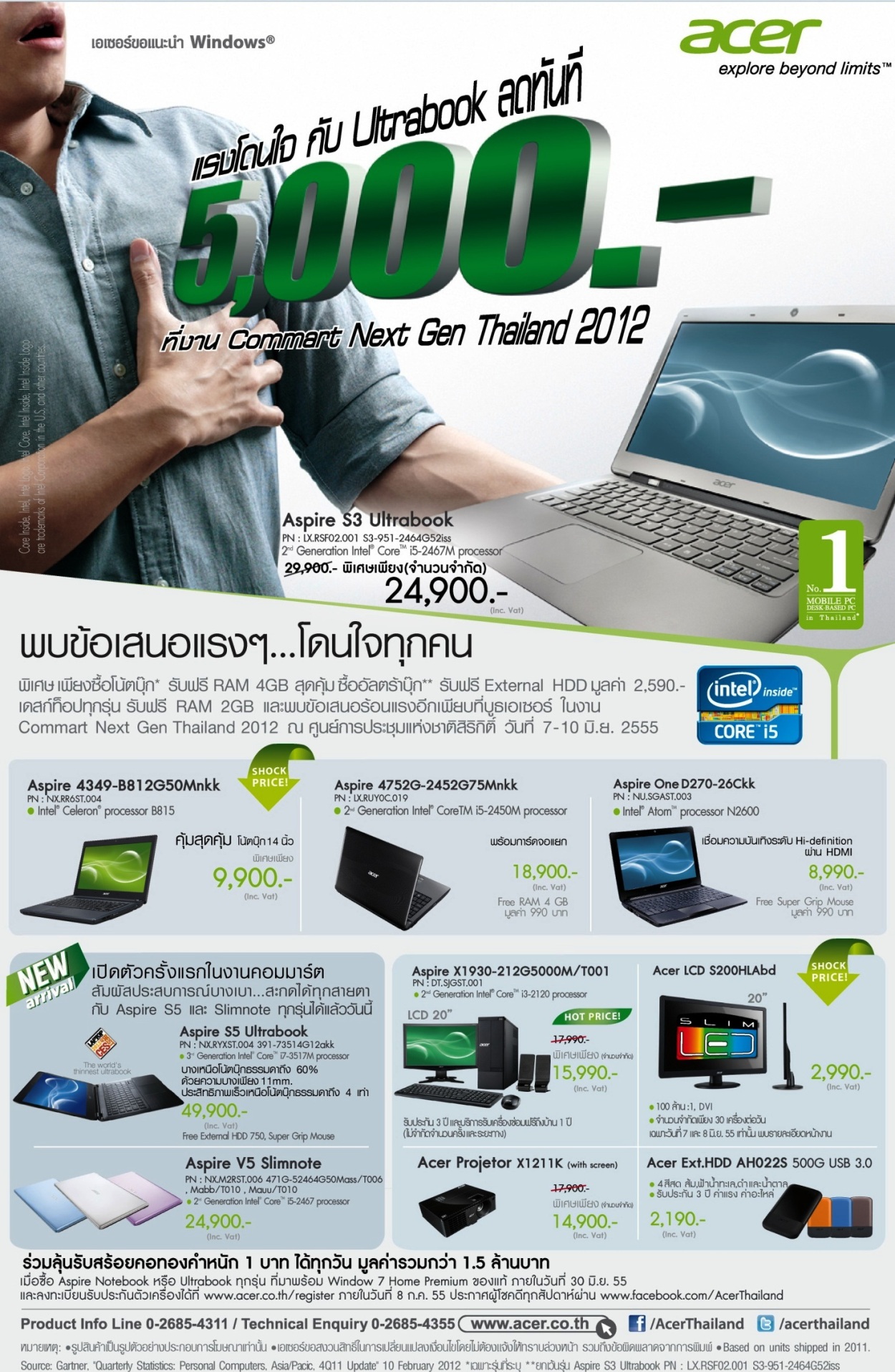 - Aspire S3 UltrabookTM พบกับความบางเบา เร็วแรง ที่เหนือกว่าด้วย Intel® CoreTM i5-2467M Processor, HDD 500GB ในราคาพิเศษ 24,900 บาท (รวมภาษีมูลค่าเพิ่ม) จำนวนจำกัด หมดแล้วหมดเลย