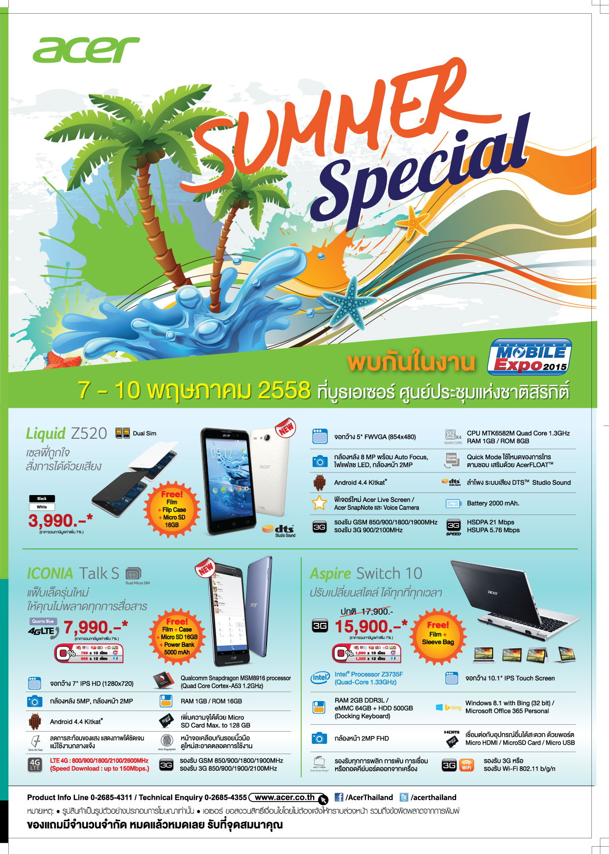 Acer Summer Special พบกันในงาน Thailand Mobile Expo 2015 วันที่ 7-10 พฤษภาคม 2558 ที่บูธเอเซอร์ ศูนย์ประชุมแห่งชาติสิริกิติ์