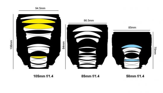 AF-S NIKKOR 105mm f/1.4E ED มีขนาดใหญ่มากเมื่อเทียบขนาดกับเลนส์ Prime รุ่นอื่น