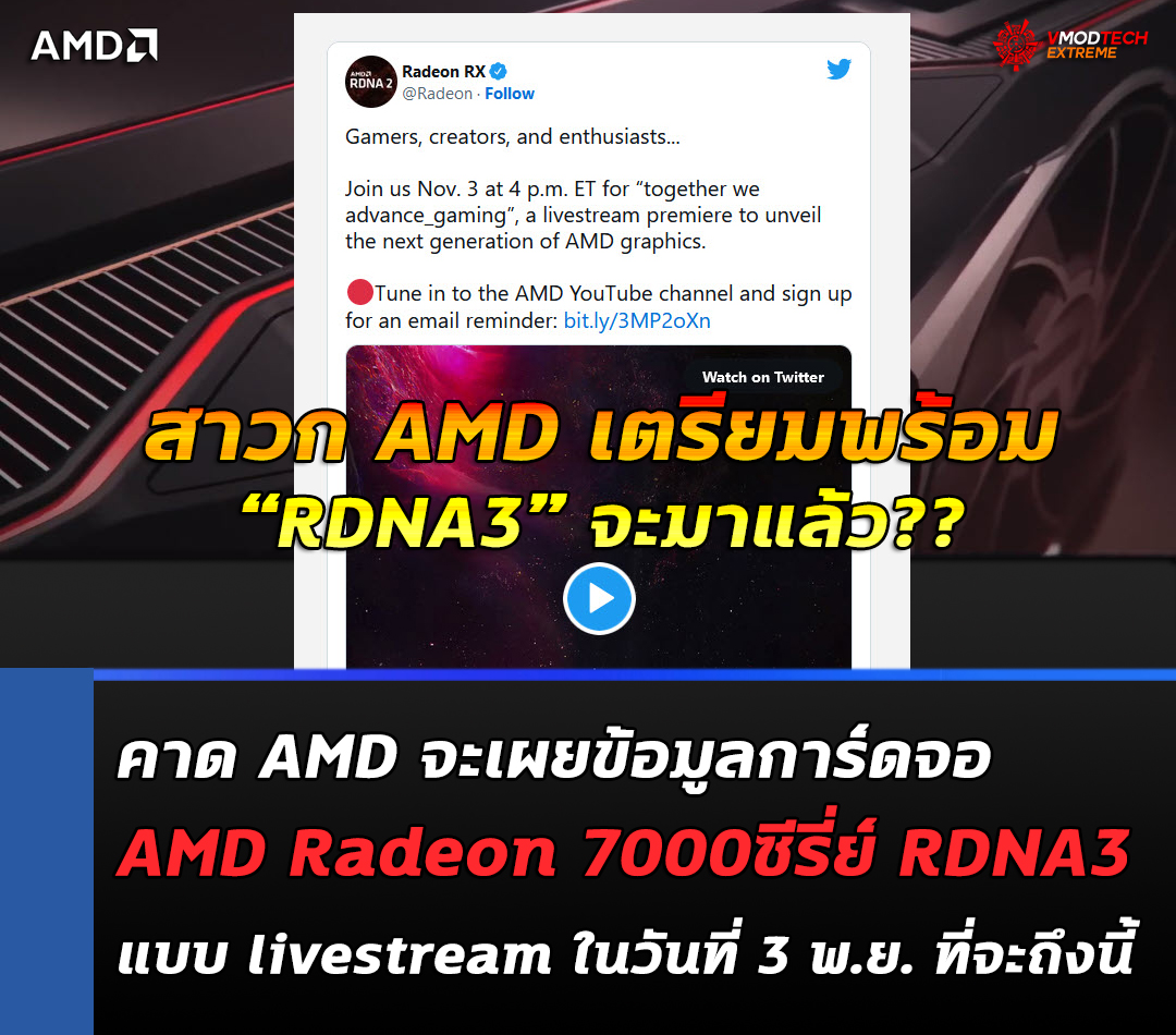 คาด AMD จะเผยข้อมูลการ์ดจอ AMD Radeon 7000ซีรี่ย์ RDNA3 แบบ livestream ในวันที่ 3 พ.ย. ที่จะถึงนี้