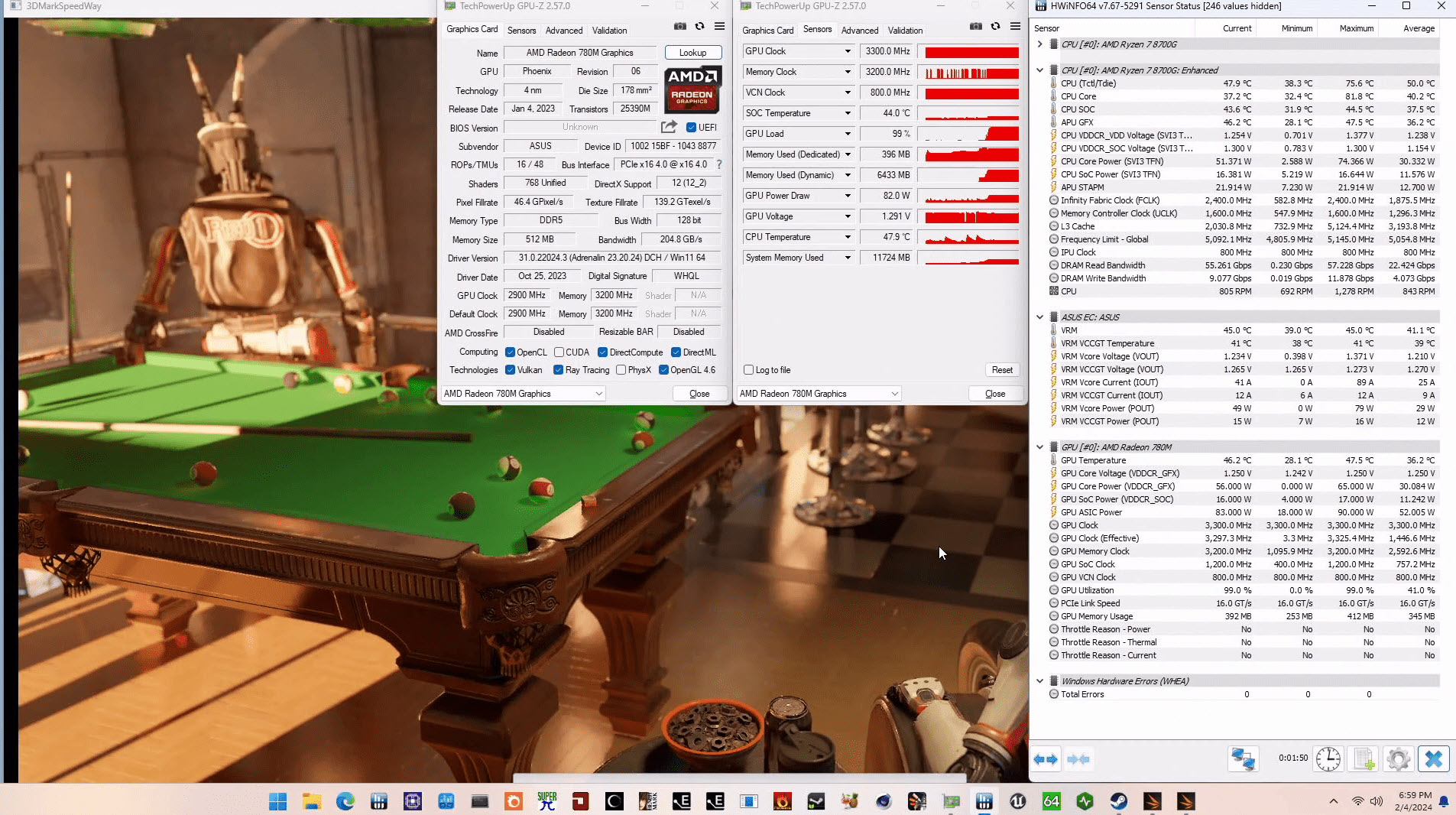 AMD Radeon 780M iGPU การ์ดจอในซีพียู Ryzen 8700G สามารถโอเวอร์คล็อกได้สูงถึง 3300 MHz ประสิทธิภาพเพิ่มขึ้นกว่า 60% กินไฟสูงสุด 177W