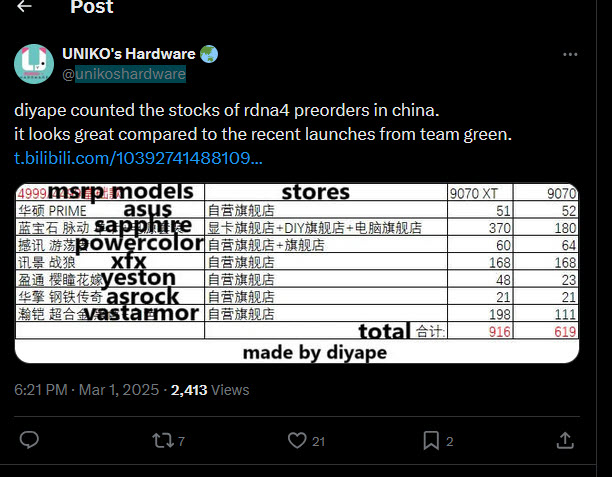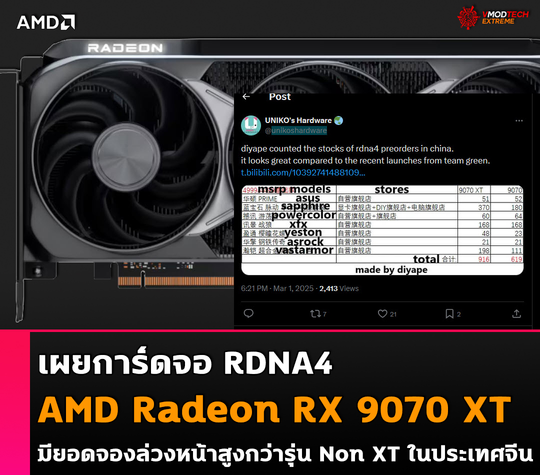 วันนี้ก็มีข่าวจากฝั่ง AMD หลุดออกมาให้เราได้ชมกันครับกับข่าวของการ์ดจอ AMD Radeon RX 9070 XT มียอดจองล่วงหน้าสูงกว่ารุ่น Non XT ในประเทศจีนจากการรายงานของทาง unikoshardware ซึ่งยอดจองจากร้านออนไลน์สูงถึง 916ตัวในรุ่น AMD Radeon RX 9070 XT ส่วนในรุ่น Non XT อยู่ที่ 619ตัว ก็ถือเป็นรุ่นที่ได้รับความนิยมในจีนรวมไปถึงราคาที่ไม่สูงมากนักสำหรับการ์ดจอ RDNA4 รุ่นใหม่ของ AMD ครับ