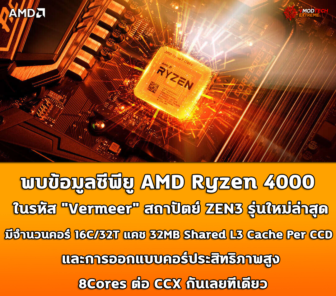 พบข้อมูลซีพียู AMD Ryzen 4000 ในรหัส “Vermeer” สถาปัตย์ ZEN3 รุ่นใหม่ล่าสุดมีจำนวนคอร์ 16C/32T แคช 32MB Shared L3 Cache Per CCD และการออกแบบคอร์ประสิทธิภาพสูง 8Cores ต่อ CCX กันเลยทีเดียว