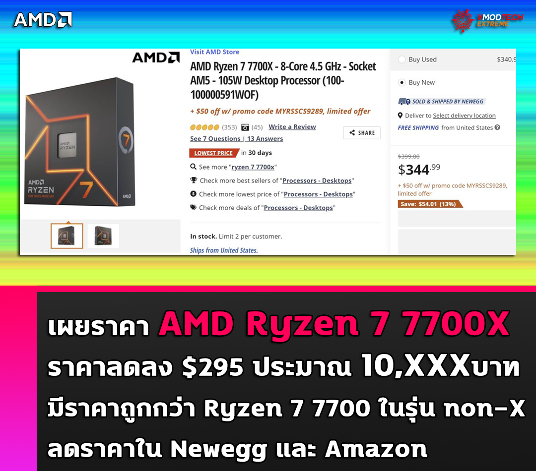 วันนี้ก็มีข่าวจากฝั่ง AMD หลุดออกมาให้เราได้ชมกันครับกับข่าวของการ์ดจอ AMD Ryzen 7 7700X ราคาลดลง $295 อยู่ที่ประมาณ 10,XXXบาท มีราคาถูกกว่า Ryzen 7 7700 ในรุ่น non-X จากการประกาศราคาจากทาง Newegg และ Amazon ซึ่งราคาเปิดตัว AMD Ryzen 7 7700X ราคาเปิดตัวอยู่ที่ $399 จากราคาดังกล่าวก็คาดว่าน่าจะเป็นการปรับราคาน่าจะเป็นไปตามแผนของ AMD ร่วมมือกับทางร้านค้าปลีก แต่สำหรับในไทยเรานั้นยังไม่ปรับลดลงแต่อย่างใดครับ