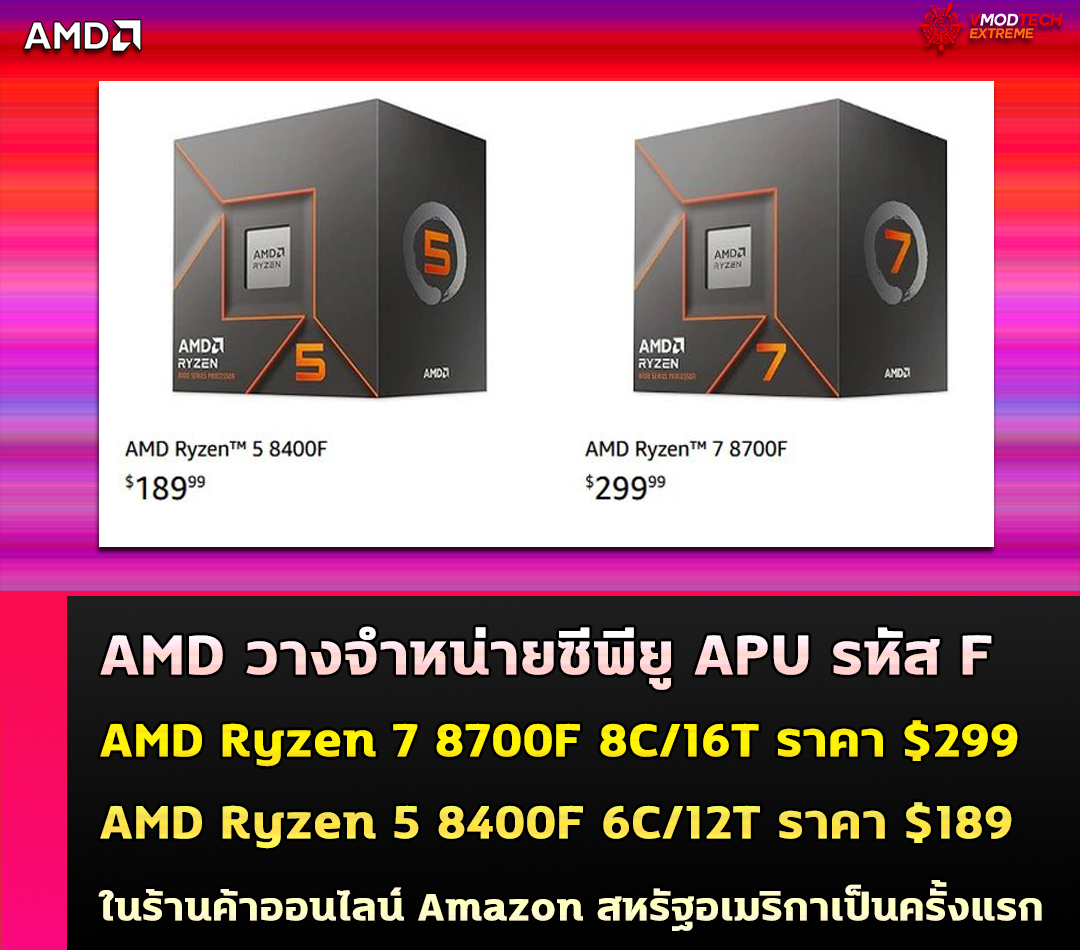 วันนี้ก็มีข่าวจากฝั่ง AMD ออกมาให้เราได้ชมกันครับกับข่าวของซีพียู AMD Ryzen 7 8700F และ Ryzen 5 8400F ที่เป็นซีพียู APU สถาปัตยื Zen 4 ที่ตัดการ์ดจอในตัวออกในรหัส F ที่ก่อนหน้านี้ได้วางขายเฉพาะฝั่งประเทศจีนและในไม่กี่วันที่ผ่านมาก็วางขายที่ประเทศแคนนาดา มาในวันนี้ปรากฏว่าได้ถูกวางจำหน่ายในฝั่งอเมริกาใน (Amazon US) ราคาอยู่ที่ AMD Ryzen 7 8700F ในราคา $299 และ Ryzen 5 8400F ในราคา $189 ซึ่งเป็นการวางจำหน่ายในฝั่งอเมริกาเป็นครั้งแรก ก้ถือเป็นข่าวน่าสนใจครับแต่สำหรับในเอเชียหรือในไทยเรายังเงียบๆ