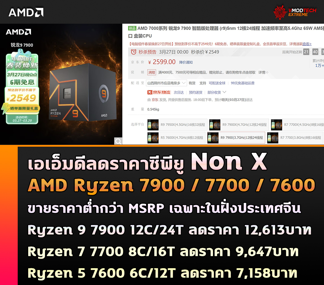 วันนี้ก็มีข่าวจากทาง AMD มาอัพเดทให้เราได้ชมกันครับกับการลดราคาซีพียู AMD Ryzen 7900/7700/7600 รุ่น non-X ราคาต่ำกว่า MSRP เฉพาะในฝั่งประเทศจีน โดยราคา Ryzen 9 7900 รุ่น non-X แบบ 12 คอร์ซึ่งเปิดตัวที่ 4299 RMB หยวน และ 429 USD ในสหรัฐอเมริกา ตอนนี้วางจำหน่ายในราคาเพียง 2,599 RMB หยวนหรือ 370 USD หรือประมาณ 12613บาท ราคาถูกกว่า MSRP อย่างเป็นทางการจและยังรวมภาษีการขาย (13%) อีกด้วย ไม่ใช่แค่ Ryzen 9 7900 เท่านั้นที่ลดราคา รวมไปถึงการจัดโปรโมชั่นของ Ryzen 7 7700 ราคาตอนนี้อยู่ที่ 1949 RMB หยวน (283 USD) หรือประมาณ 9647บาท ซึ่งน้อยกว่า MSRP ที่เปิดตัวที่ (329 USD) และในรุ่น Ryzen 5 7600 ก็ปรับราคาลงเช่นกันอยู่ที่ 1,449 RMB หยวน (210 USD) หรือ 7158บาท ซึ่งต่ำกว่า MSRP อย่างเป็นทางการที่ 249 USD อีกด้วยครับ ถือเป็นการปรับราคาที่น่าสนใจมากๆ ครับ แต่ในไทยก็ยังไม่ลดยังเงียบอยู่นะครับก็หวังว่าในไทยเราจะปรับลดลงในเร็วๆ นี้