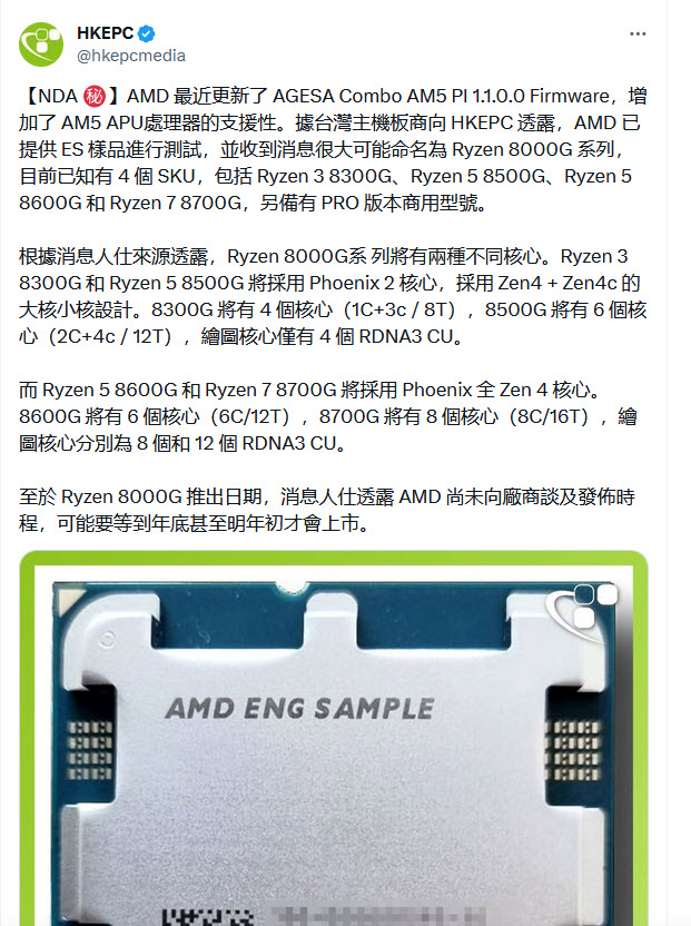 วันนี้ก็มีข่าวจากฝั่ง AMD มาอัพเดทให้ได้ชมกันครับกับข่าวของซีพียู AMD Ryzen 8000G “Phoenix” APU เดสก์ท็อปรุ่นใหม่ที่มีข่าวมาก่อนหน้านี้กับการอัพเดทไบออส AGESA Combo AM5 PI 1.1.0.0 Firmware ของบรรดาเมนบอร์ด X670/X670E ที่อัพเดทไบออสไว้รอซีพียูรุ่นใหม่ โดยวันนี้ได้รับการเปิดเผยจากทาง HKPC ที่ได้เผยภาพกระดองซีพียูพร้อมทั้งเผยว่าเป็นรุ่น AMD Ryzen 8000G “Phoenix” APU เดสก์ท็อปรุ่นใหม่คาดเปิดตัว 4รุ่น 8700G/8600G/8500G และ 8300G ใช้สถาปัตย์ Zen4c การ์ดจอ RDNA3 โดยทาง AMD พร้อมจะเปิดตัว 4รุ่นได้แก่ Ryzen 3 8300G, Ryzen 5 8500G และ Ryzen 5 8600G. และ Ryzen 7 8700G, รุ่น PRO Ryzen 8000G จะมีคอร์ที่แตกต่างกันสองคอร์ Ryzen 3 8300G และ Ryzen 5 8500G จะใช้ Phoenix 2 core และใช้คอร์ขนาดใหญ่และคอร์ขนาดเล็กของ Zen4 + Zen4c 8300G จะมี 4 คอร์ (1C+3c / 8T), 8500G จะมี 6 คอร์ (2C+4c / 12T) และคอร์กราฟิกจะมี RDNA3 CU เพียง 4 คอร์เท่านั้น ในส่วนของรุ่น Ryzen 5 8600G และ Ryzen 7 8700G จะใช้ Phoenix สถาปัตย์ Zen 4 cores รุ่น 8600G จะมี 6 คอร์ (6C/12T) และ 8700G จะมี 8 คอร์ (8C/16T) โดยมี 8 และ 12 RDNA3 CUs สำหรับคอร์กราฟิกตามลำดับ สำหรับวันเปิดตัว Ryzen 8000G แหล่งข่าวเปิดเผยว่า AMD ยังไม่ได้หารือเกี่ยวกับกำหนดการเปิดตัวกับผู้ผลิตและอาจวางจำหน่ายจนถึงสิ้นปีหรือต้นปีหน้า