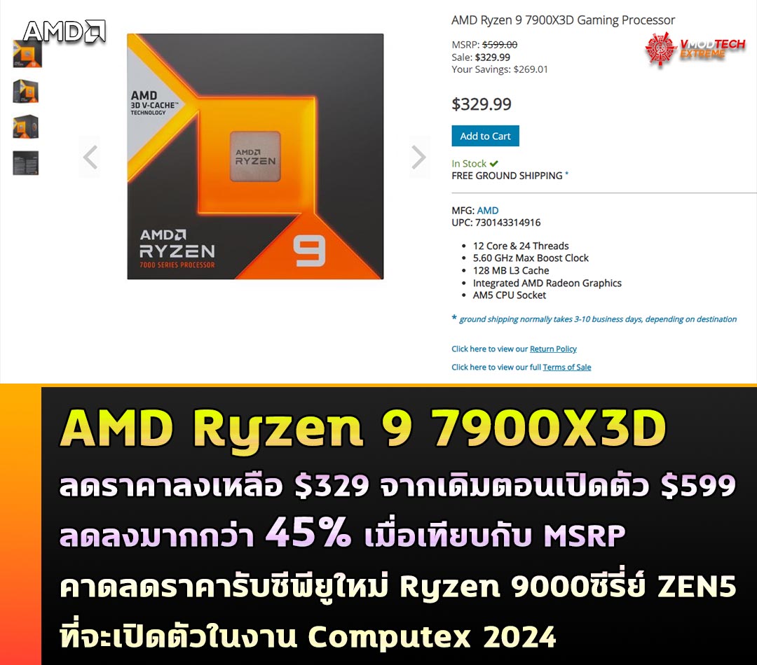 วันนี้ก็มีข่าวจากฝั่ง AMD มาอัพเดทให้ทุกท่านได้ชมกันครับ กับข่าวการปรับลดราคาซีพียู AMD Ryzen 9 7900X3D ลดราคาลงเหลือ $329 จากเดิมตอนเปิดตัว $599 โดยลดลงถึง 45% เมื่อเทียบกับ MSRP จากทางฝั่งอเมริกาในเว็บไซต์ antOnline ซึ่งคาดว่าการปรับลดราคาดังกล่าวเพื่อรับซีพียูใหม่ Ryzen 9000ซีรี่ย์ ZEN5 รุ่นใหม่ที่กำลังจะเปิดตัวในงาน Computex 2024 ช่วงเดือนหน้านี้