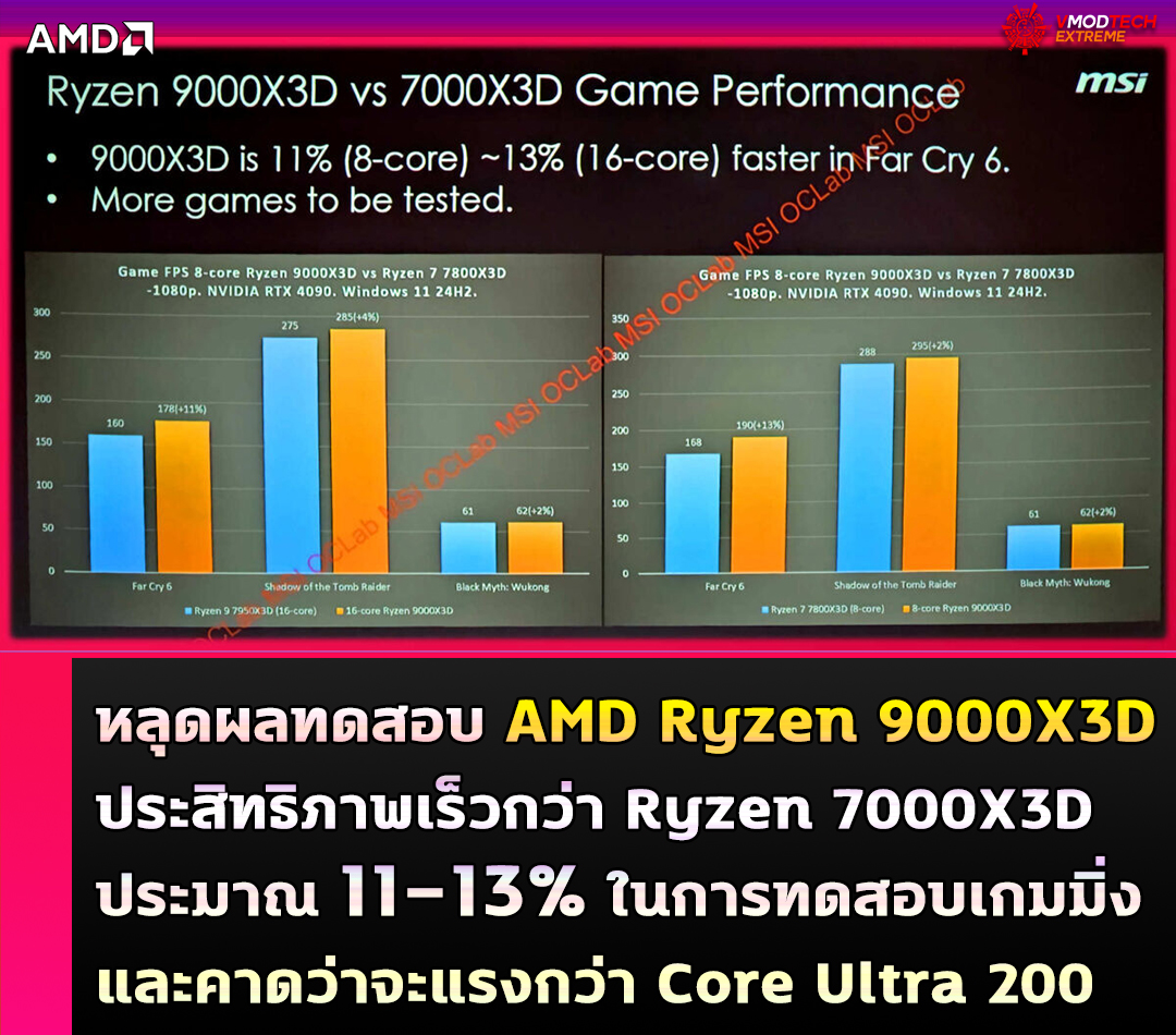 วันนี้ก็มีข่าวจากฝั่ง MSI หลุดออกมาให้เราได้ชมกันครับกับข่าวที่มีภาพหลุดผลทดสอบซีพียู AMD RYZEN 9000X3D รุ่นใหม่ที่ยังไม่เปิดตัวอย่างเป็นทางการได้รับการเปิดเผยจากทาง MSI COLba ที่เผยให้เห็นผลทดสอบเกมมิ่งของซีพียู AMD Ryzen 9000X3D ประสิทธิภาพเร็วกว่า Ryzen 7000X3D ประมาณ 11-13% และเผยน่าจะแรงกว่า Intel “Arrow Lake” ในการเล่นเกม โดยในเกมที่ MSI ทดสอบ ได้แก่ “Far Cry 6” “Shadow of the Tomb Raider” และ “Black Myth: Wukong” ซึ่งซีพียู Ryzen 7 9800X3D พบว่าประสิทธิภาพเร็วกว่าโดยเฉลี่ย 11% เทียบกับ Ryzen 7 7800X3D และในรุ่น Ryzen 9 9950X3D เร็วกว่ารุ่นก่อนถึง 13% เมื่อเทียบกับ Ryzen 9 7950X3D โดยคาดว่าซีพียู AMD Ryzen 9000X3D จะเปิดตัวช่วงเดือนพฤศจิกายนนี้ครับ