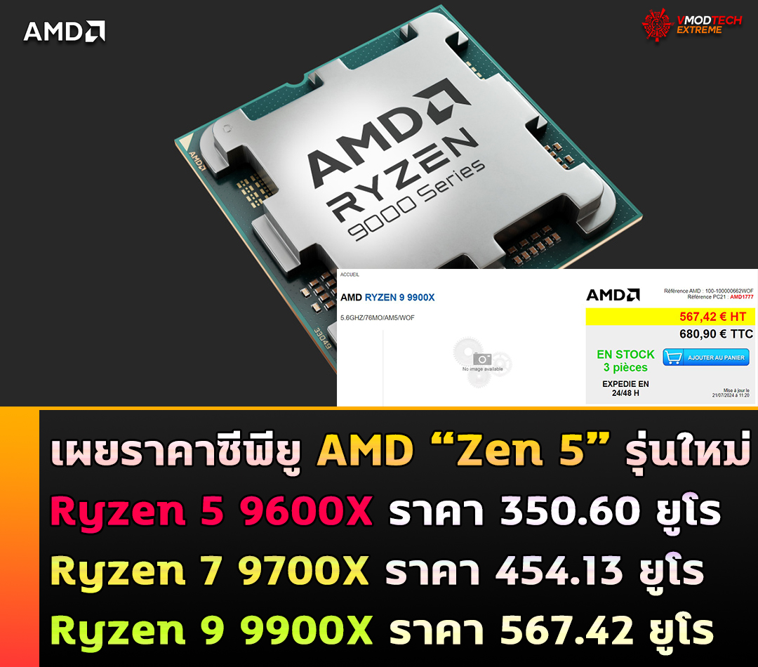 วันนี้ก็มีข่าวจากฝั่ง AMD หลุดออกมาให้เราได้ชมกันครับกับข่าวของซีพียู AMD “Zen 5” รุ่นใหม่ล่าสุดที่กำลังจะเปิดตัวในเร็วๆ นี้ หลุดออกมากับราคาวางจำหน่ายที่ถูกเปิดเผยในร้านค้าของทางฝั่งยุโรปในประเทศฝรั่งเศสที่หลุดออกมา 3รุ่นก็คือ ราคาซีพียู Ryzen 5 9600X อยู่ที่ที่ 350.60 ยูโร, Ryzen 7 9700X อยู่ที่ที่ 454.13 ยูโร, Ryzen 9 9900X ที่ 567.42 ยูโร เมื่อแปลงราคาเป็น USD ซีพียู AMD Ryzen 5 9600X จะอยู่ที่ 381.72 ดอลลาร์, Ryzen 7 9700X อยู่ที่ 494.43 ดอลลาร์ และ Ryzen 9 9900X อยู่ที่ 617.78 ดอลลาร์ ก็ถือเป็นราคาที่สูงขึ้นมากครับเพราะบวกภาษี 20% เพราะทางฝั่งยุโรปราคาจะสูงกว่าความเป็นจริงครับ สำหรับในบ้านเราก็ยังไม่เปิดเผยราคาออกมาอย่างเป็นทางการครับ รอดูน่าจะปลายเดือนนี้แน่นอนครับ